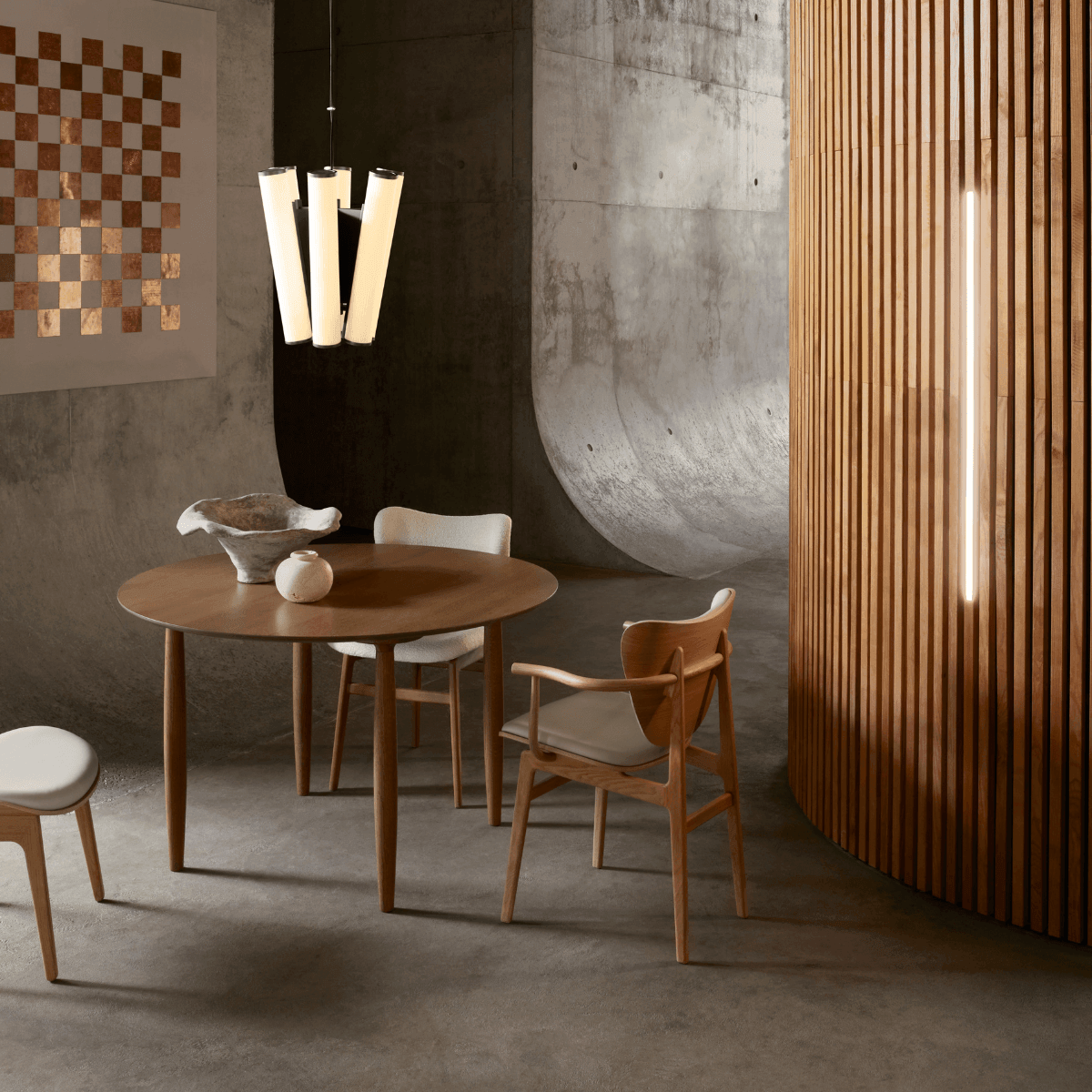 Tisch Das Auge ist eine Interpretation des japanischen Wortes, was die "ōku" -Reak bedeutet. Arbeitsplatte Tisch Das Auge besteht aus Eichenfurnier mit abgerundeten Kanten, was ein ausgeklügeltes Detail einer großen Oberfläche hinzufügt. Die Beine aus den Abschnitten von Eichenholz werden sporadisch platziert, um die Illusion einer schwebenden Arbeitsplatte zu erzeugen, während der Tisch skulpturale Details hinzugefügt werden.