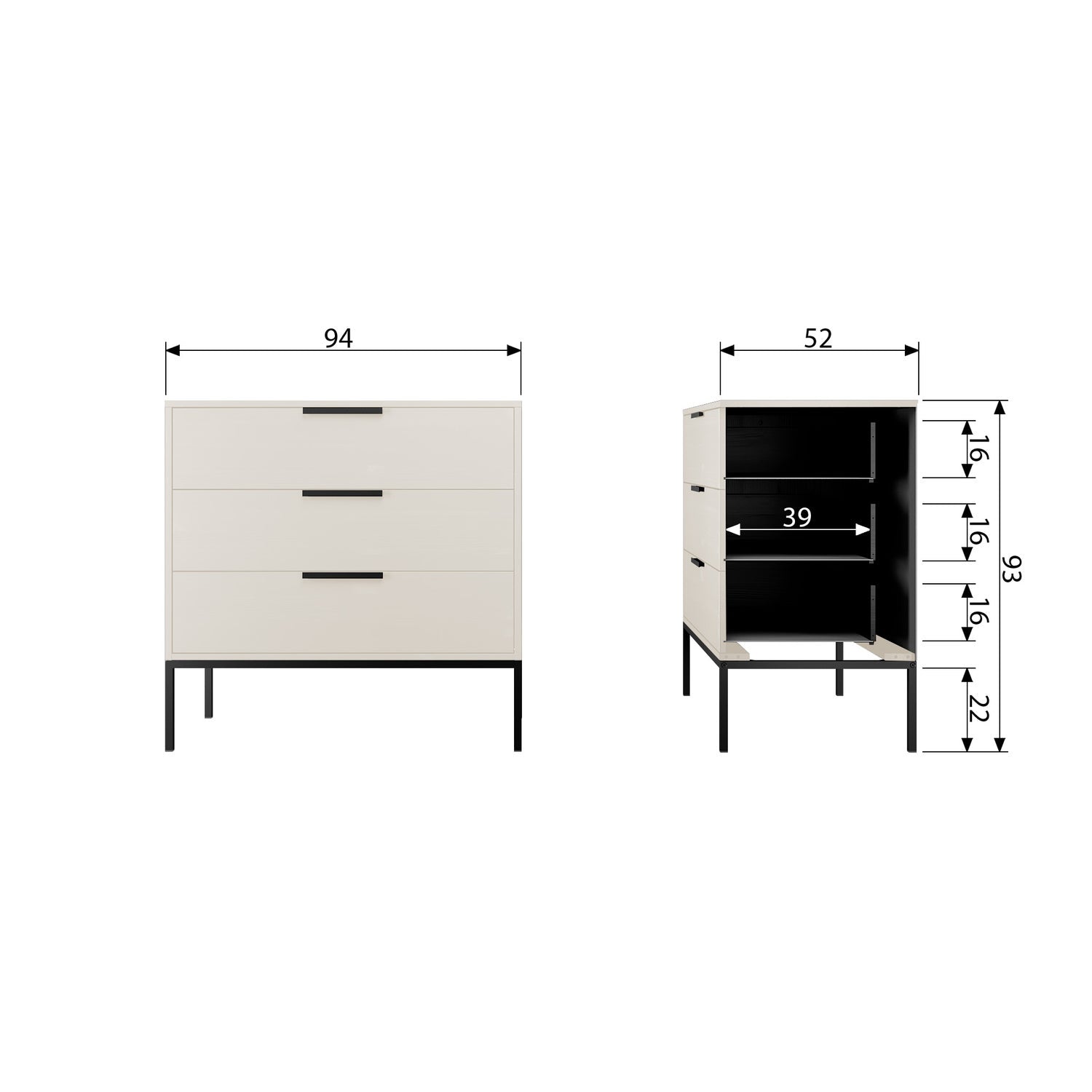Drei kräftige Schubladen bieten viel Stauraum, was die Kommode zur perfekten Wahl für das Schlafzimmer, das Wohnzimmer oder den Flur macht. Stilvolle Griffe und eine stabile Basis wurden mit einer matten schwarzen Pulverbeschichtung beendet und verleihen den Möbeln einen modernen Akzent.
