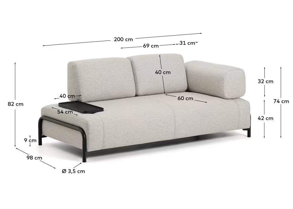 Elegantes 2-Sitzer Sofa Compo vereint modernes Design, hohe Funktionalität und Umweltbewusstsein. Ihre robuste Konstruktion aus pulverbeschichtetem Stahl mit mikrotexturiertem Finish garantiert Langlebigkeit, während das praktische Tablett aus Eichenfurnier einen besonderen Charakter verleiht. Die mittelfeste Sitzfläche aus Schichten von Schaumstoff und elastischen Bändern sorgt für Komfort und die richtige Unterstützung, sodass das Sofa ideal für den täglichen Gebrauch geeignet ist.