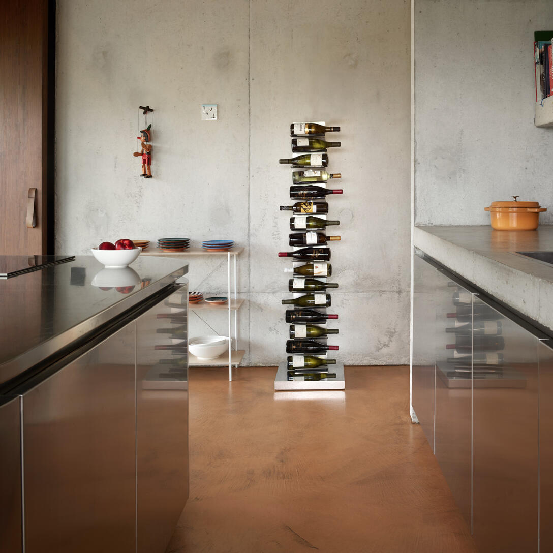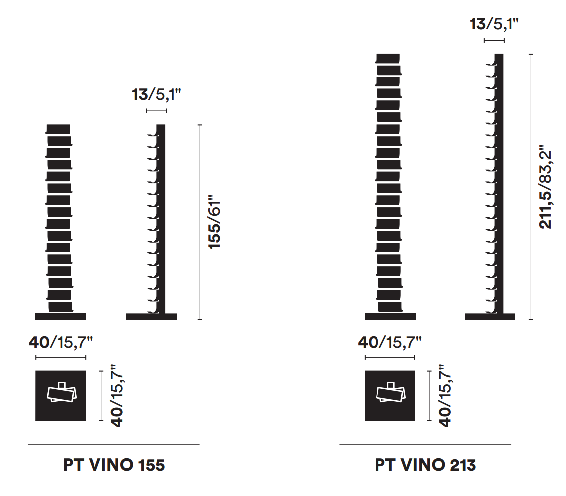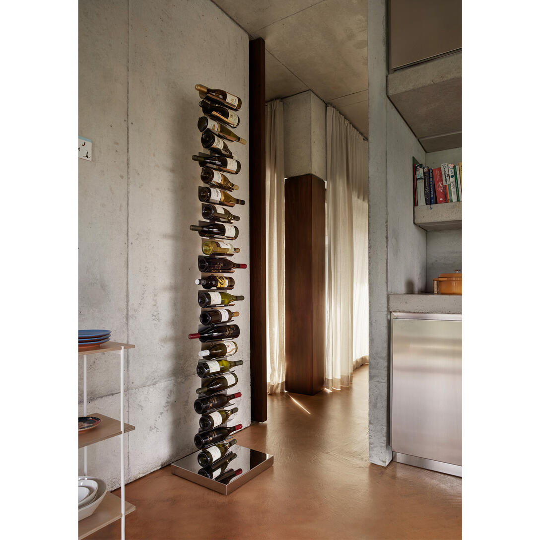 Verfügbar in zwei Höhen und verschiedenen Farbvarianten – darunter mattschwarz, glänzend weiß, Cortenstahl und Edelstahl – fügt sich Ptolomeo Vino perfekt sowohl in moderne Wohnräume als auch in kommerzielle Bereiche ein: Restaurants, Weinkeller oder Hotellobbys. Rutschfeste, flexible Bänder sichern jede Flasche und unterstützen deren angemessene Lagerung und Reifungsprozess.