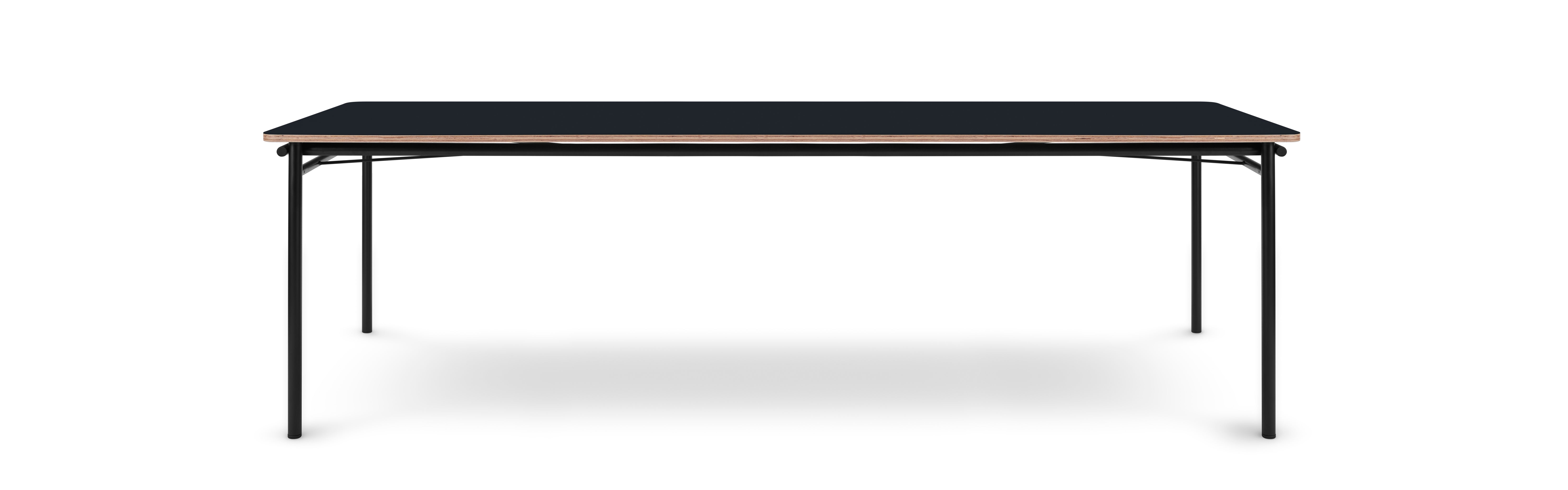 Der Tisch wurde aus langlebigen und robusten Materialien gefertigt, die Widerstandsfähigkeit gegen den täglichen Gebrauch bieten und gleichzeitig ein modernes, elegantes Aussehen bewahren. Die Tischplatte aus Furnier, das mit Linoleum beschichtet ist, ist sowohl ästhetisch als auch praktisch, und die sichtbare Kante aus Sperrholz verleiht ihm einen rohen, industriellen Charakter. Die schlanken, pulverbeschichteten Stahlbeine runden das Gesamtbild ab und machen Taffel zu einem zeitlosen und besonders praktischen Möbelstück.
