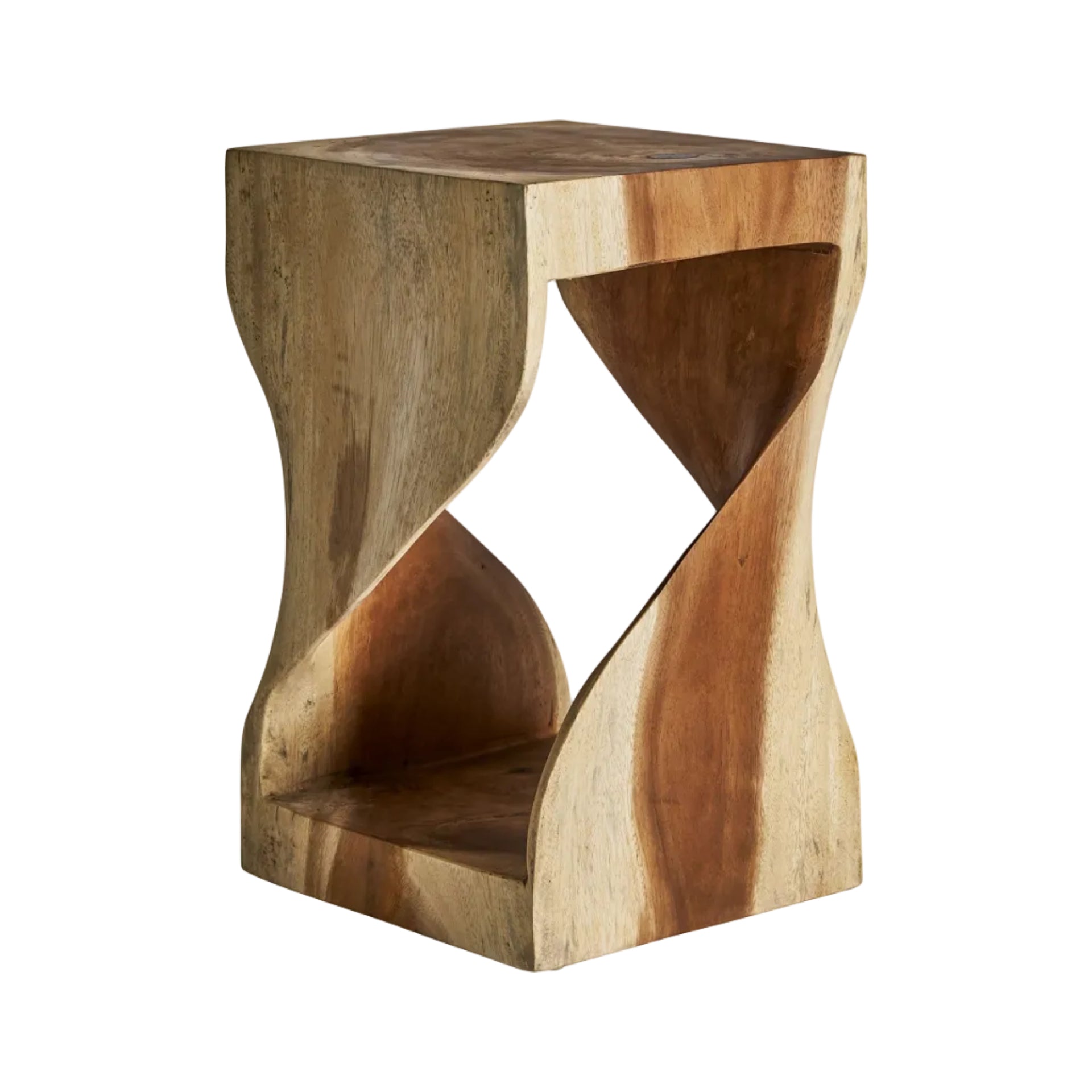 Der Beistelltisch Maun, handgefertigt, zeichnet sich durch die einzigartigen Eigenschaften des Holzes aus, wie Äste, Risse oder Unregelmäßigkeiten, die seinen natürlichen Charme betonen. Dank seiner kompakten Form ist dieser elegante Beistelltisch die ideale Wahl für kleinere Räume, die funktionale und stilvolle Einrichtungselemente benötigen.