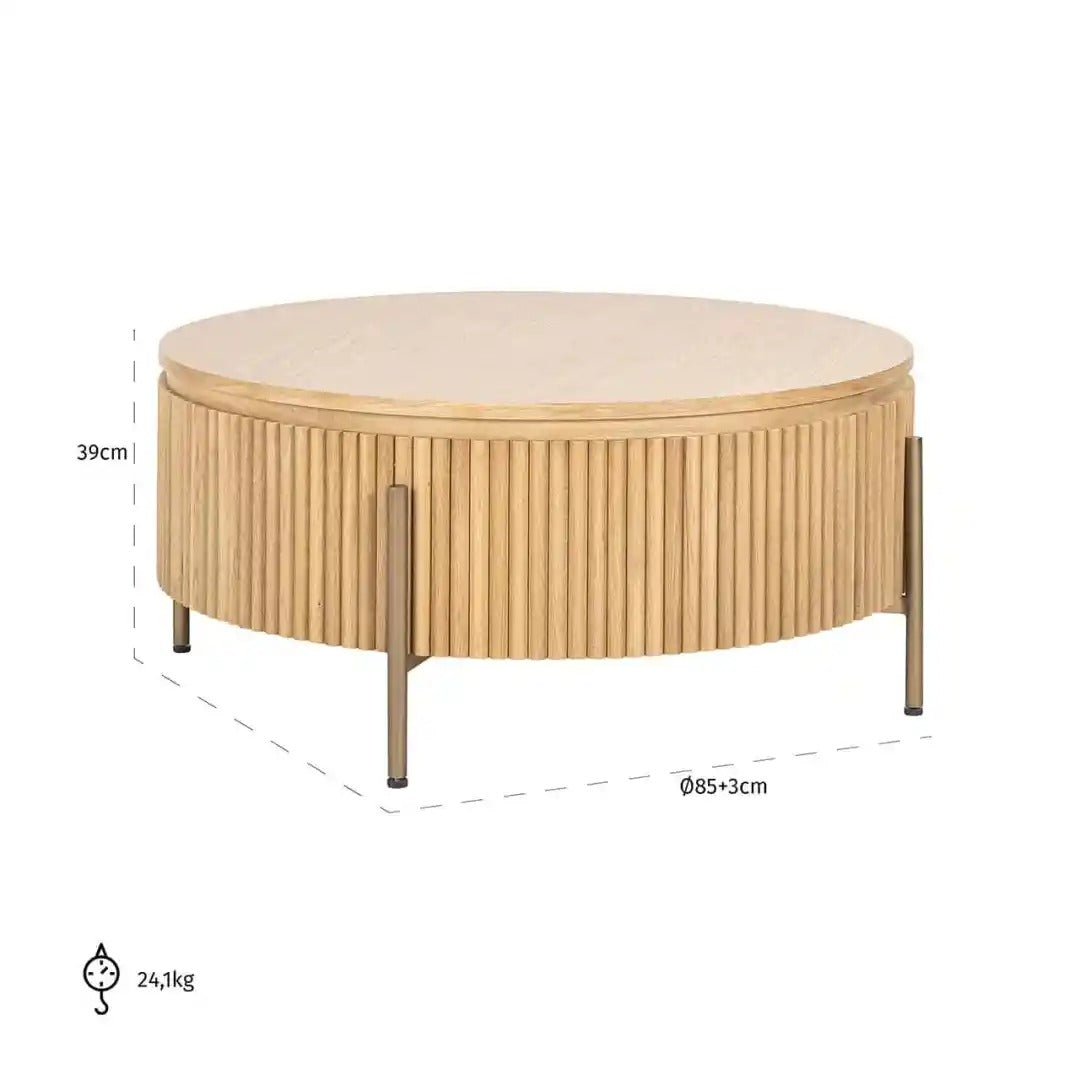 Eleganter Couchtisch Belfort in runder Form ist eine harmonische Verbindung aus natürlichen Materialien und modernem Design. Die geriffelte Oberfläche in einem hellen Holzton verleiht dem Möbelstück Leichtigkeit und zieht gleichzeitig mit ihrem dekorativen Finish die Blicke auf sich. Die Metallbeine in der Farbe von gebrochenem Kupfer verleihen der Konstruktion Stabilität und einen edlen Akzent.