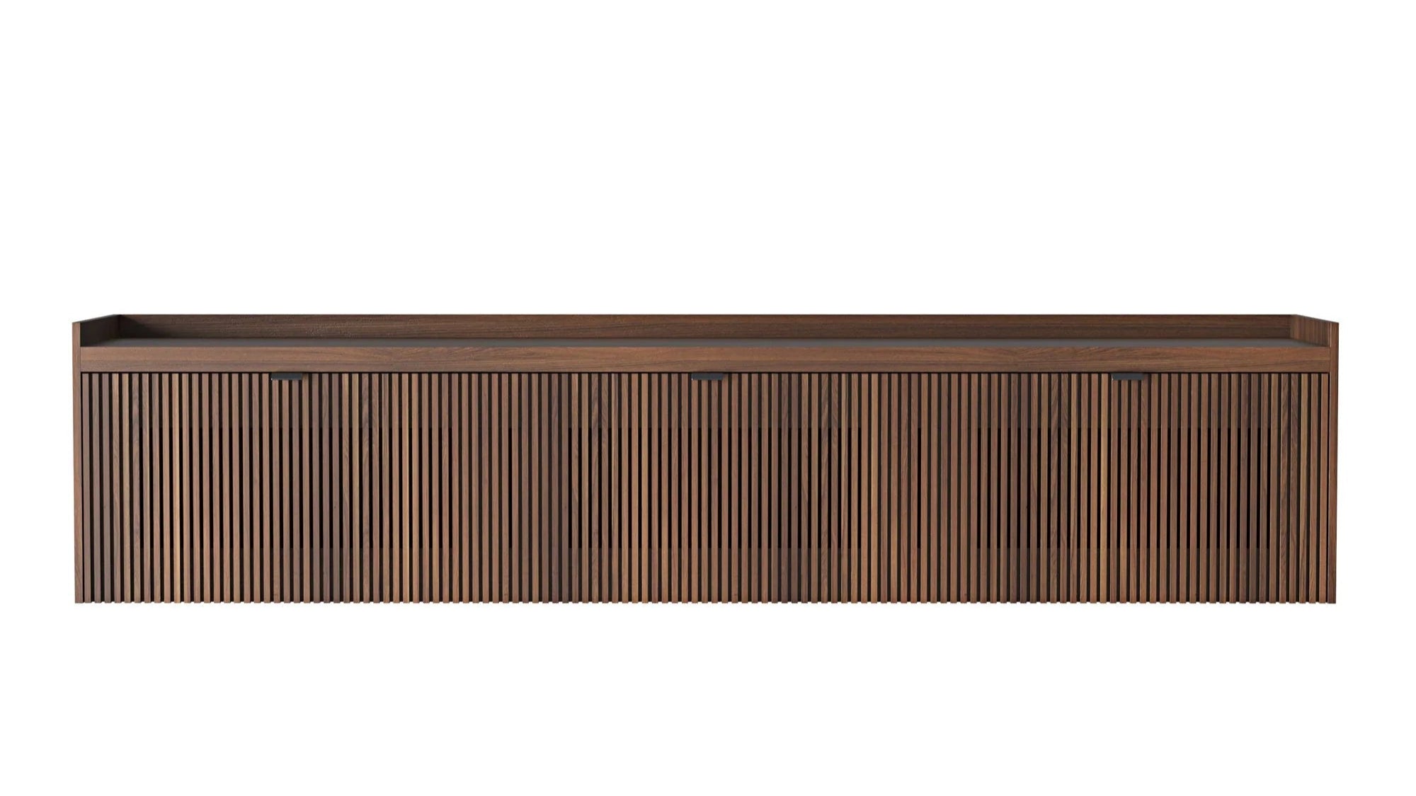 Die RTV Meda ist eine Verbindung des minimalistischen Geistes mit der dekorativen Kraft der Form. Die charakteristischen, gefrästen Fronten bringen Rhythmus und Struktur in den Raum und werden zu einem subtilen, aber markanten Akzent. Das Design basiert auf präzisen Proportionen, und seine hängende Form verleiht selbst den anspruchsvollsten Räumen Leichtigkeit und Modernität.