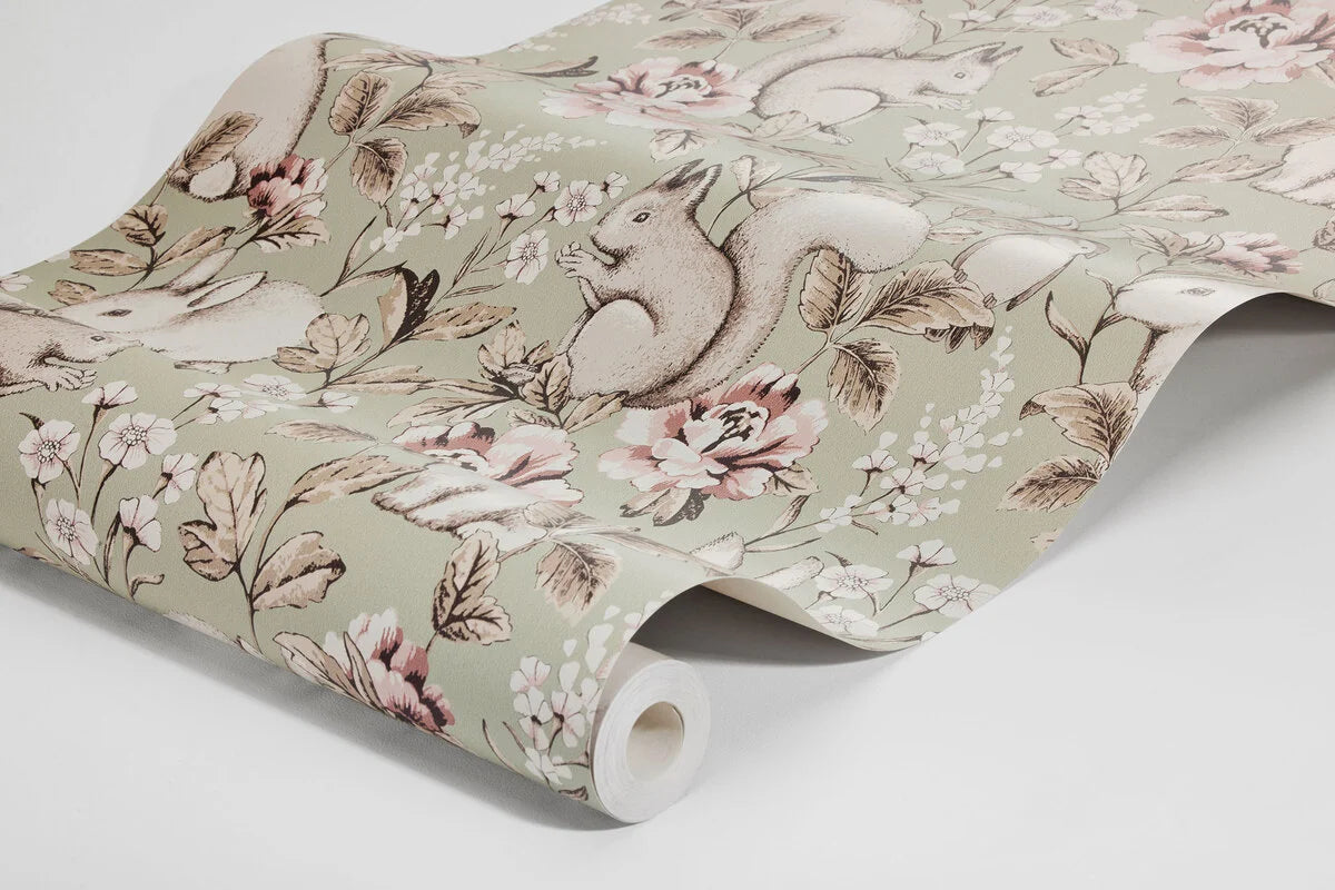 Tapete Magic Forest ist ein märchenhaftes Kinderdesign, das in die Welt der Waldabenteuer und der Fantasie entführt. Vor einem von der Natur inspirierten Hintergrund erscheinen niedliche Tiere wie Kaninchen und Eichhörnchen, umgeben von zarten Blumen und pflanzlichen Motiven. Das Gesamtbild schafft eine harmonische und charmante Komposition, die die Kreativität des Kindes fördert und eine warme, gemütliche Atmosphäre in den Raum bringt. Es ist eine Dekoration, die mit dem Kind wächst und ihren zeitlosen Charakter bewahrt.