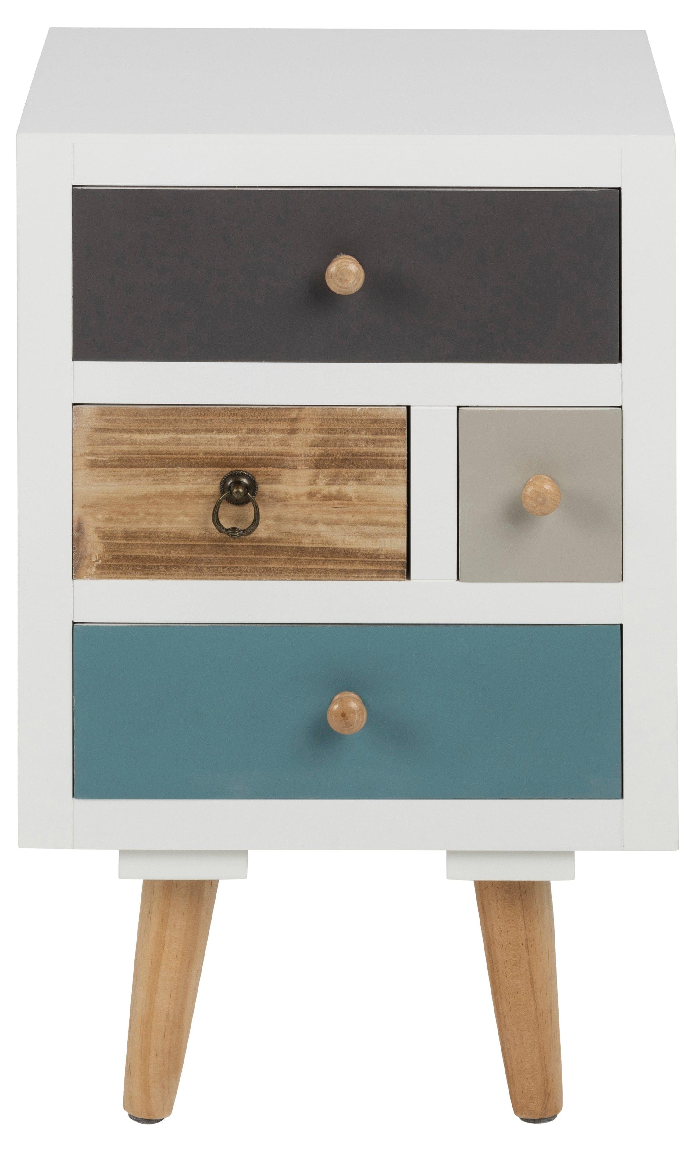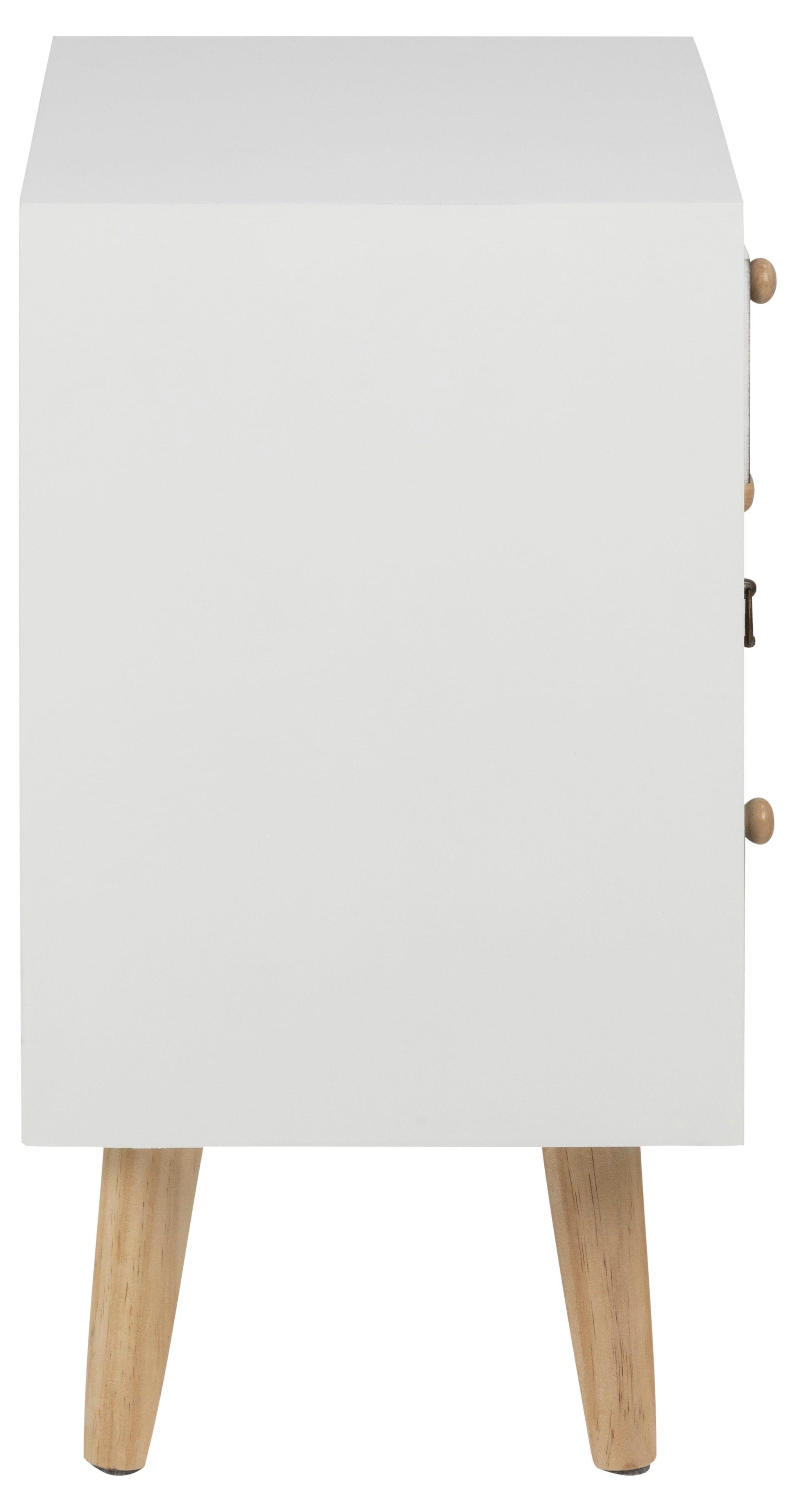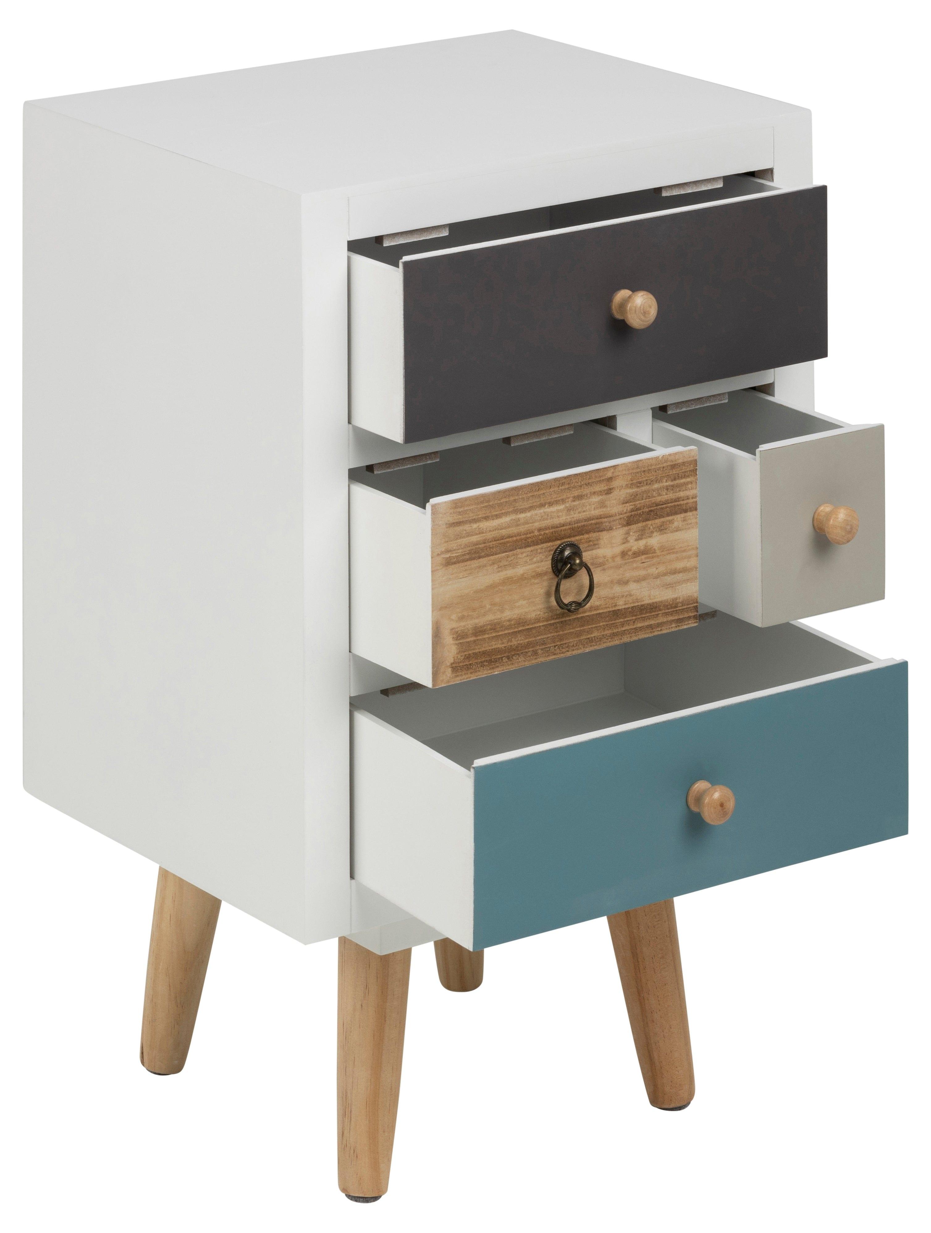 Nachttisch Thais in White ist ein exzentrisches Angebot, das selbst des anspruchsvollsten Kunden die Aufmerksamkeit auf sich zieht. Mehrfarbige Schubladen verleihen dem gesamten Projekt einen Charme und bieten es auch ein ungewöhnliches Design. Dank vier Schubladen kann der Thais -Nachttisch alle Ihre wichtigsten Artikel aufnehmen.