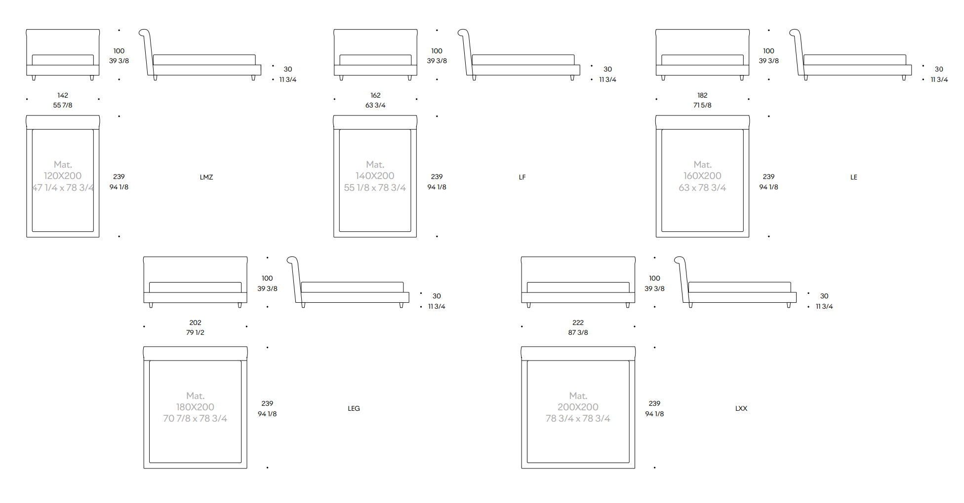 Schlafbereich: 120x200, 140x200, 160x200, 180x200, 200x200 cm