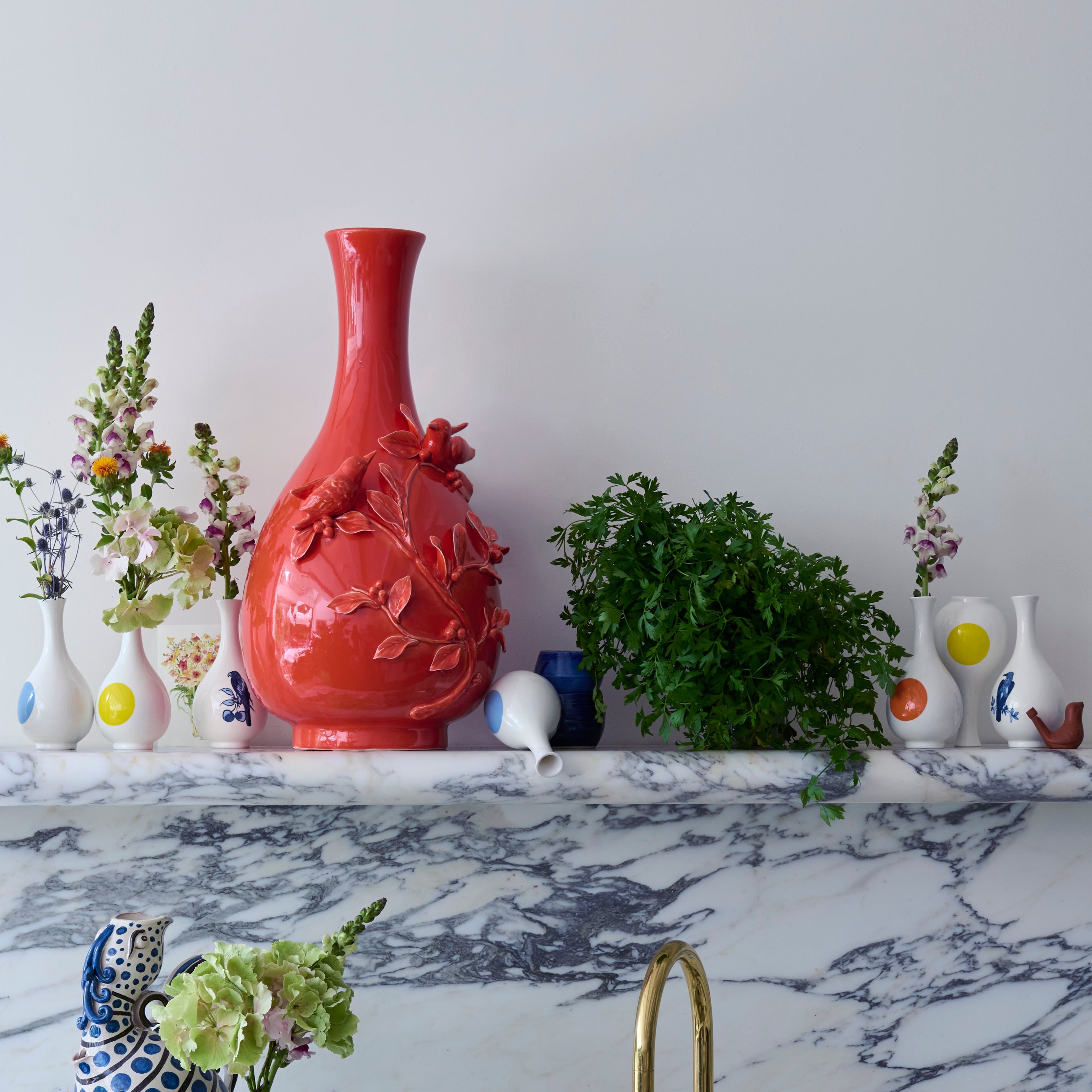 Wazon 3D Vögel ist ein einzigartiges Dekorationsobjekt, das Geschichte, Kunst und zeitgenössisches Design vereint. Die ikonische Form wurde neu interpretiert, wobei die erkennbare Gestalt beibehalten und gleichzeitig eine frische, künstlerische Energie gewonnen wurde. Die Vase ist inspiriert von den Sammlungen des Rijksmuseums aus dem 17. Jahrhundert und zieht mit ihrer reichen Glasur sowie subtilen Vogelmotiven, die in den skulpturalen Kurven verborgen sind, die Aufmerksamkeit auf sich.