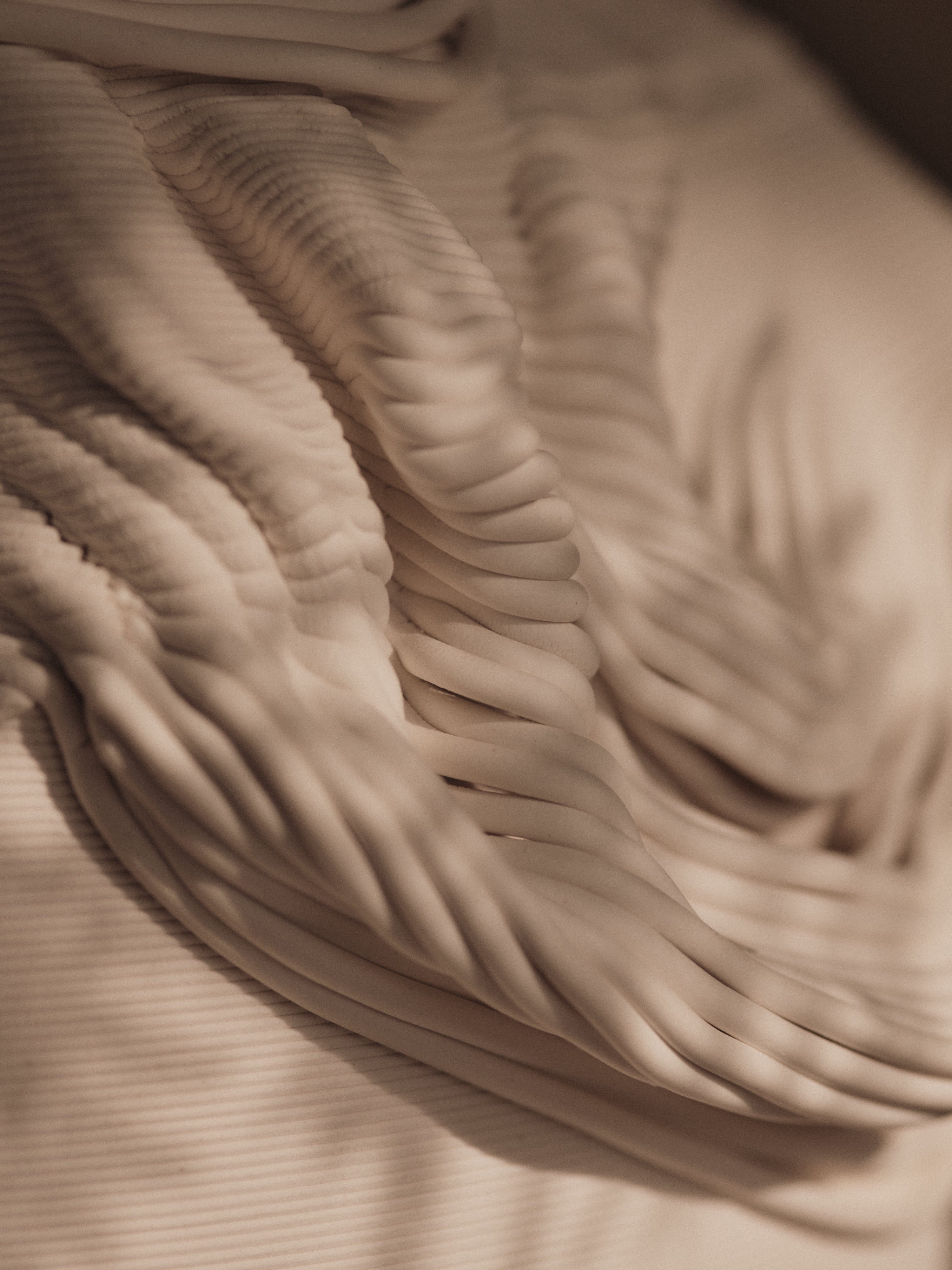 Die Vase Drisca ist eine Verbindung traditioneller Form mit moderner Fertigungstechnik, die einen einzigartigen visuellen und haptischen Effekt erzeugt. Hergestellt aus Steinzeug unter Verwendung von 3D-Drucktechnologie, begeistert sie mit einem subtilen, matten Finish und einem zarten, bandartigen Muster, das an weich fallende Stoffe erinnert. Ihr heller Farbton von gebrochenem Weiß verleiht dem Raum Eleganz und Ruhe, während die einzigartige Struktur den handwerklichen Charakter des Objekts unterstreicht. Jedes Exemplar ist aufgrund der natürlichen Unterschiede im Material und der Fertigungstechnik einzigartig.