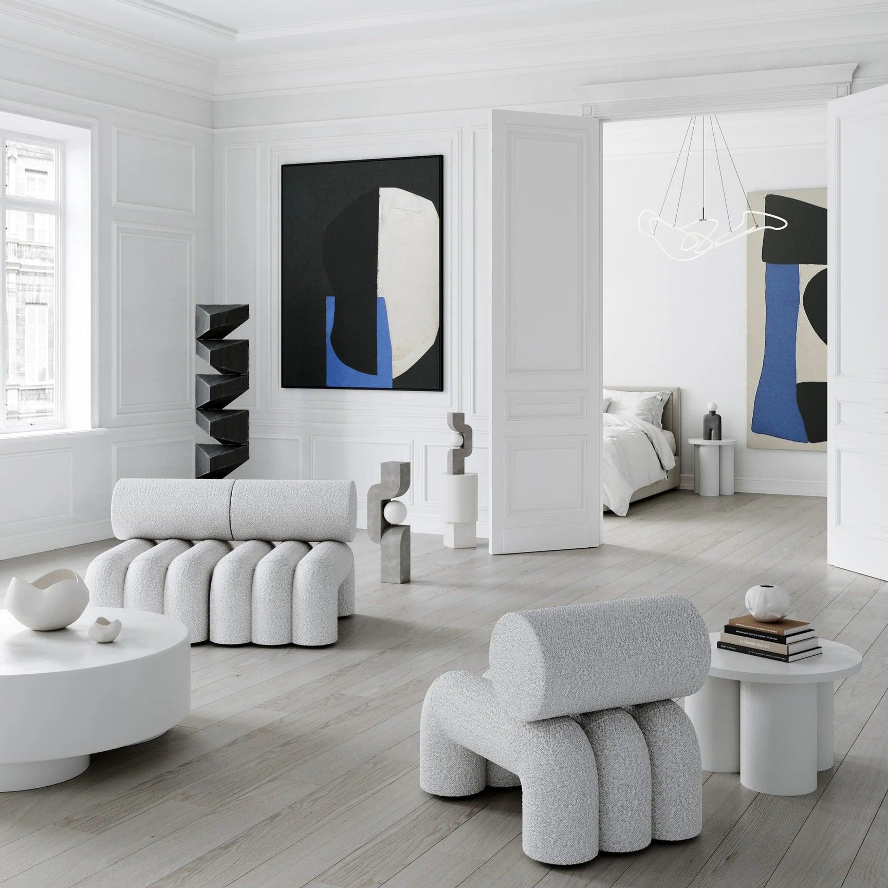 By drawing inspiration from the world of brutal architecture and contemporary sculpture, the Big Foot collection presents a characteristic aesthetics of the project, which will certainly catch the eye. Cylindrical legs exude modernity and sophistication, and the textured and painted surfaces add intriguing depth and visual attractiveness.