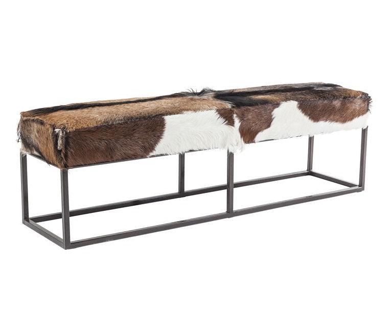 Upholstered bench Country Life tempts with its real skin covering, introducing heat and rural charm to the living room. A rectangular bench with a steel frame and a real goat skin covering - each is unique. Natural materials, such as leather, immediately introduce coziness and warmth into any room. Leather benches like this are an ideal choice for modern country houses or a crazy style.