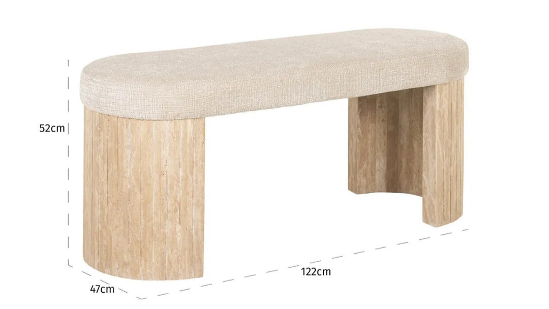 Modern bench Gallice combines the nobility of natural stone with the comfort of a soft seat. The massive base made of travertine attracts attention with its unique pattern and stone texture, while the upholstered cushion in a neutral color adds coziness and comfort. This is an exceptional piece of furniture that will work wonderfully in a bedroom, hallway, or dressing room.