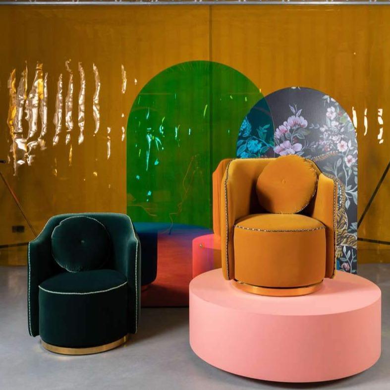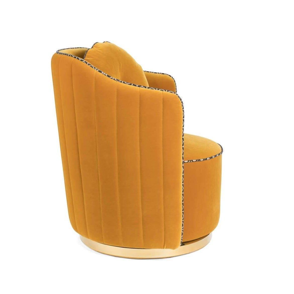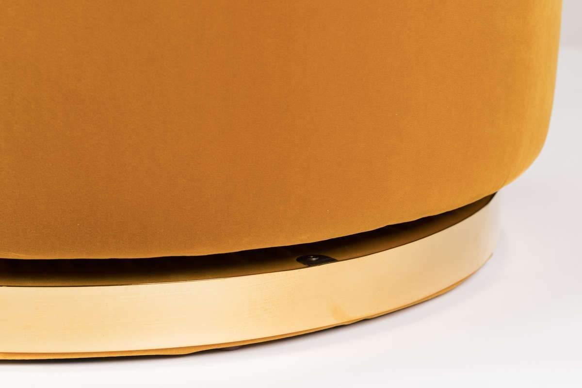The Sassa Granny armchair offers a style that would work in the wardrobe Brigitte Bardot or Marilyn Monroe. Velvet, brushed brass and contrasting printed trim They complement the style. Rotary, golden base and removable pillow ensure additional convenience.