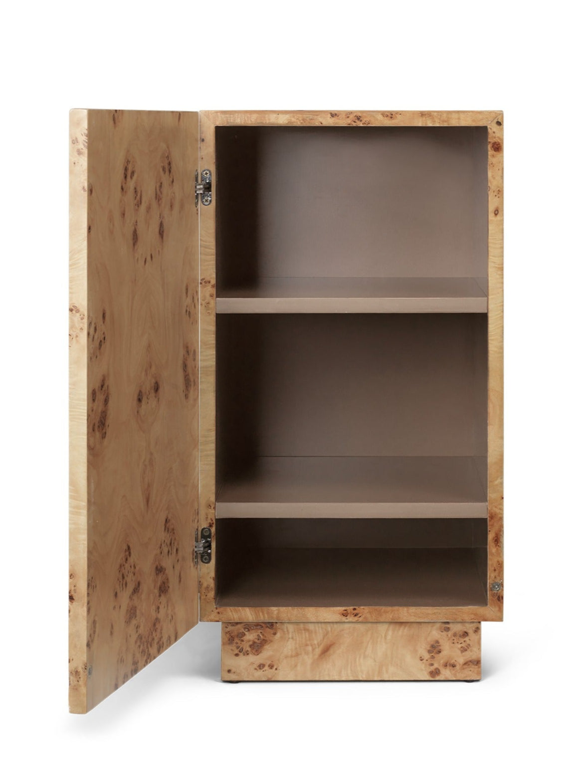 Its slender, pedestal form adds lightness and sophistication to the interior, while the hidden storage space with an adjustable shelf provides a practical place for books, accessories, or other small items. The Burl side table is a blend of functionality, style, and exceptional craftsmanship.