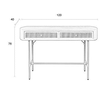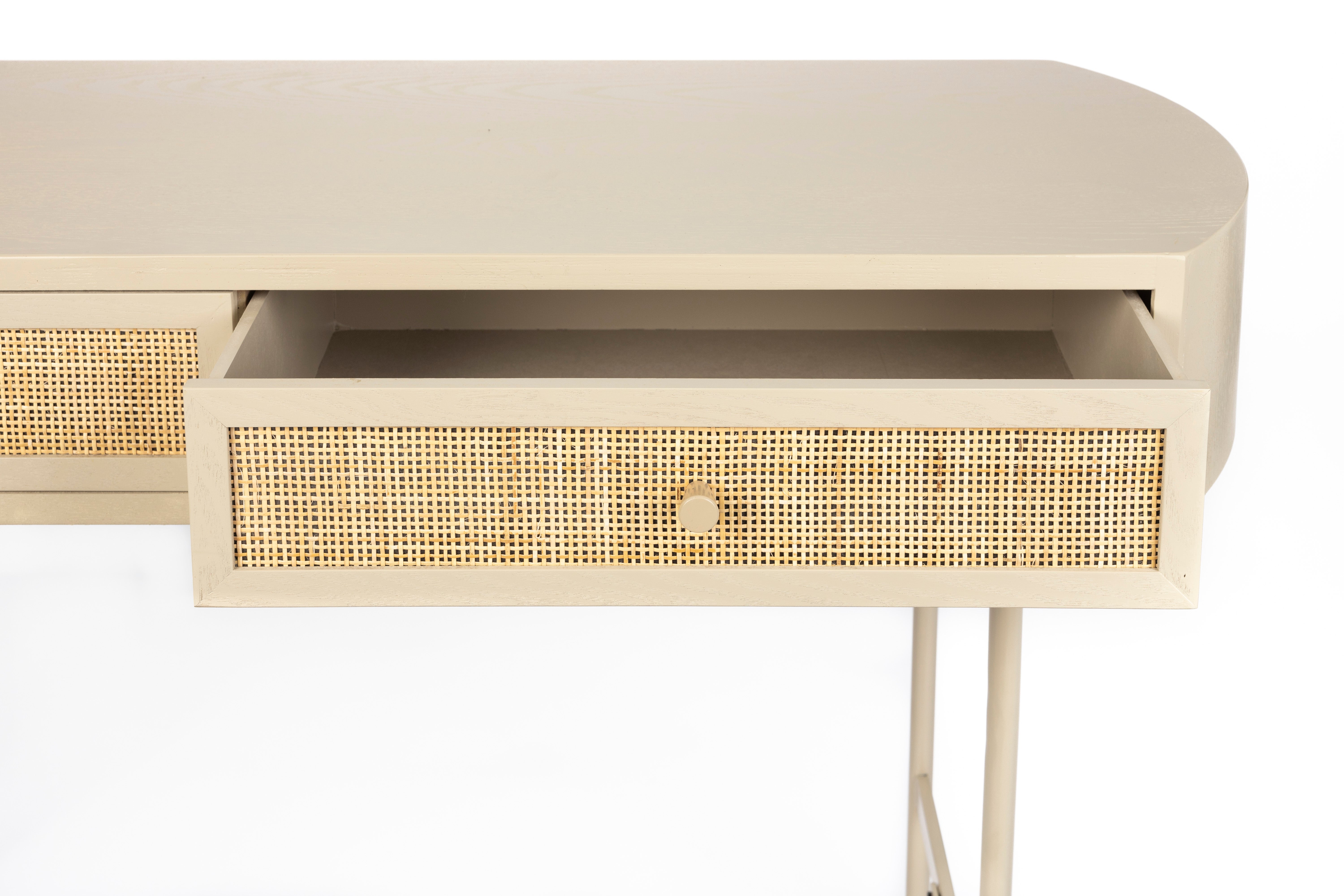 Vanity table Amaya is a piece of furniture with an unusual appearance that is distinguished by an unusual shape and a harmonious combination of three different materials. The semicircular side walls of the body and the fronts of drawers with rattan inserts in natural color attract eyes. The dressing body is made of beige varnished MDF, and metal legs powder painted to the same shade add consistency. Under the countertop there are two drawers that provide a practical storage space.