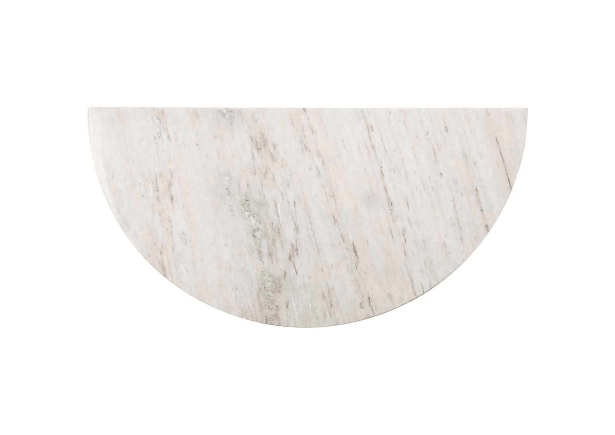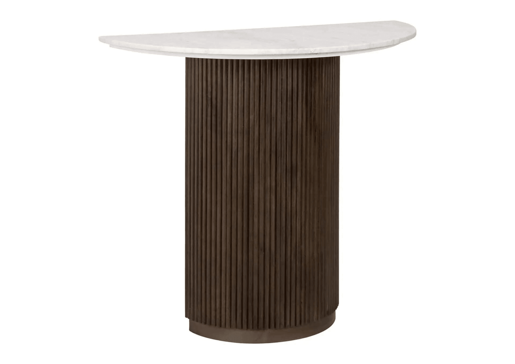 Console Mayfield is a unique furniture that attracts attention with its unique style and solid performance. Its unique semicircle shape makes it not only a functional solution, but also a designer element of interior design. The white marble top gives the console elegance and refinement, creating a effective contrast in combination with the base of milled manga wood.