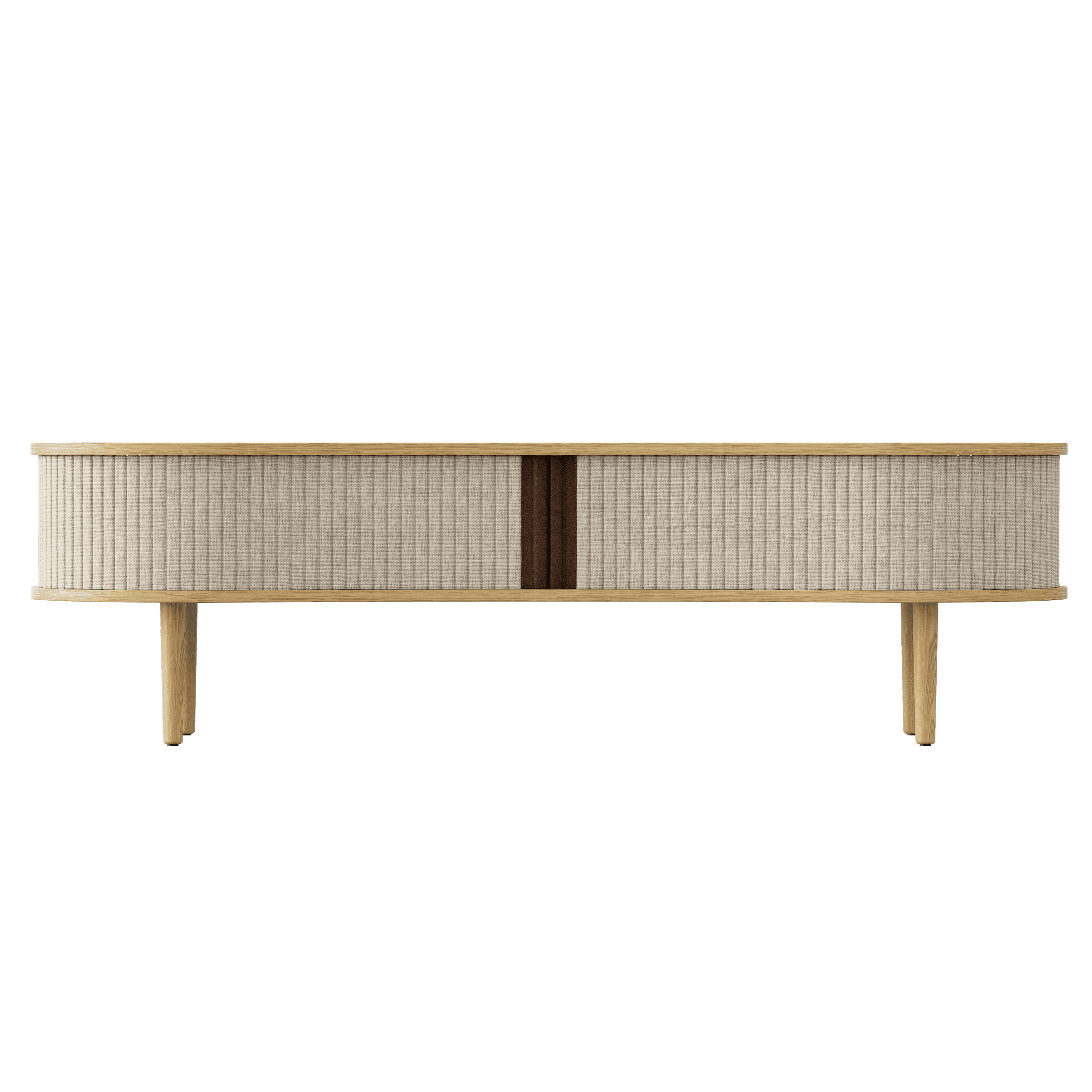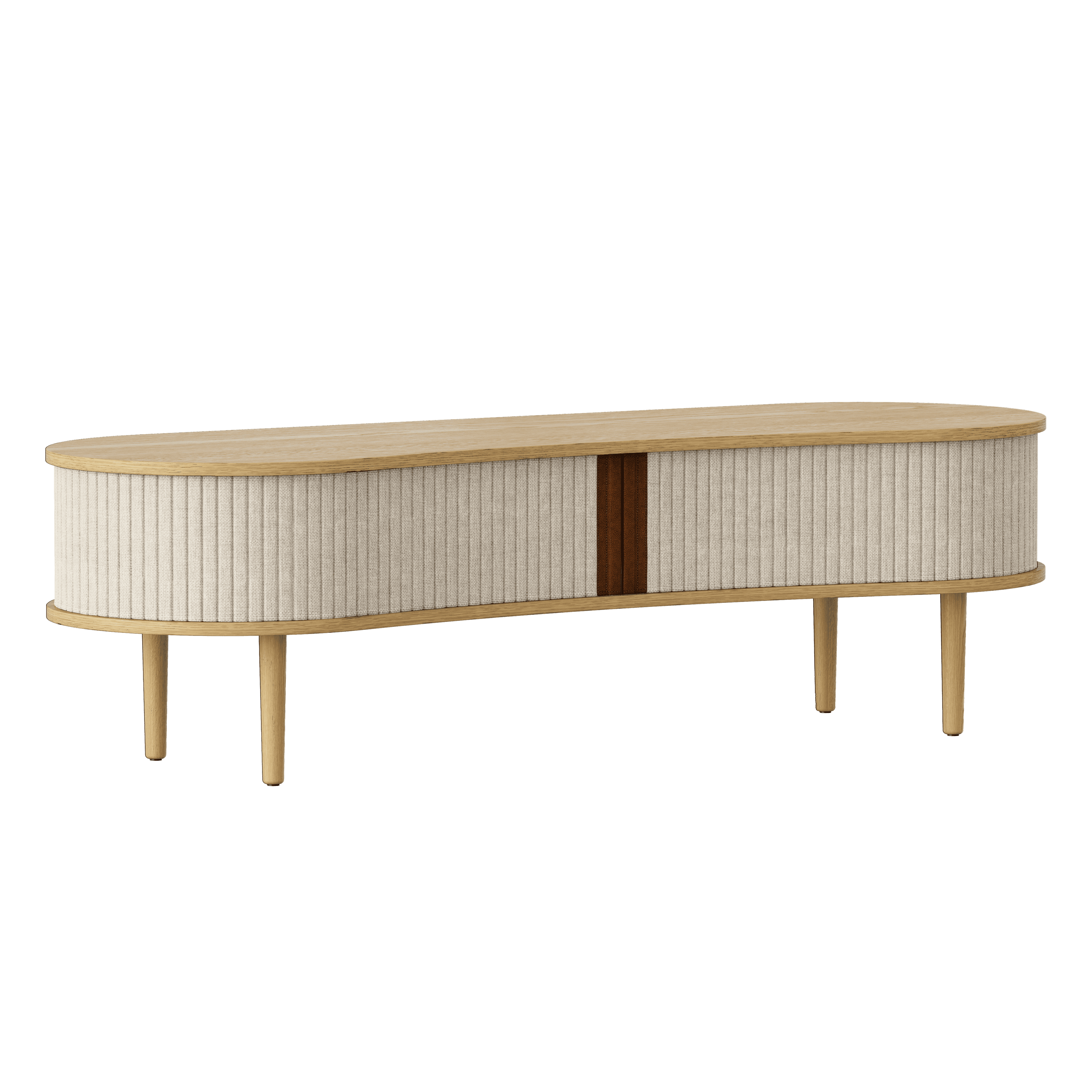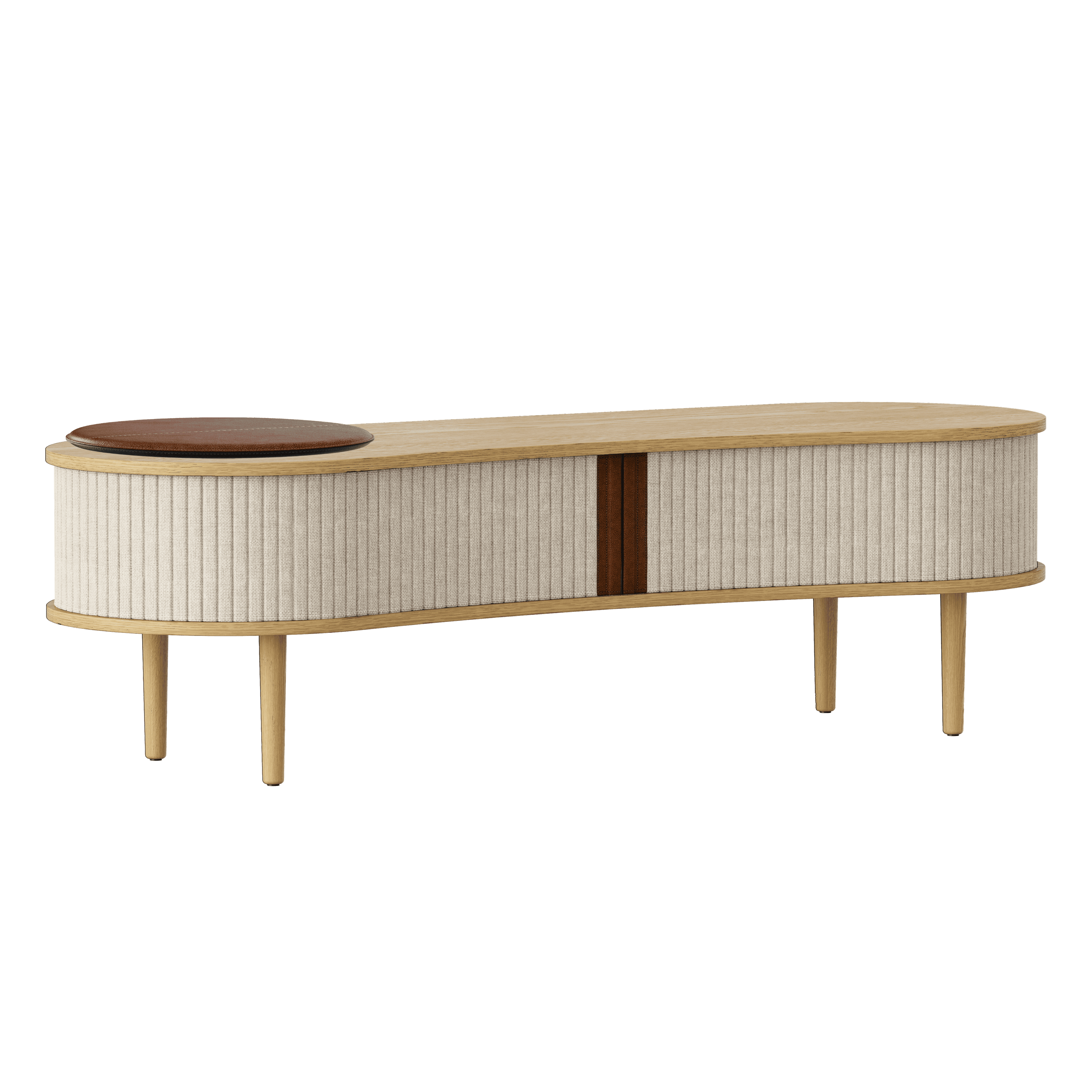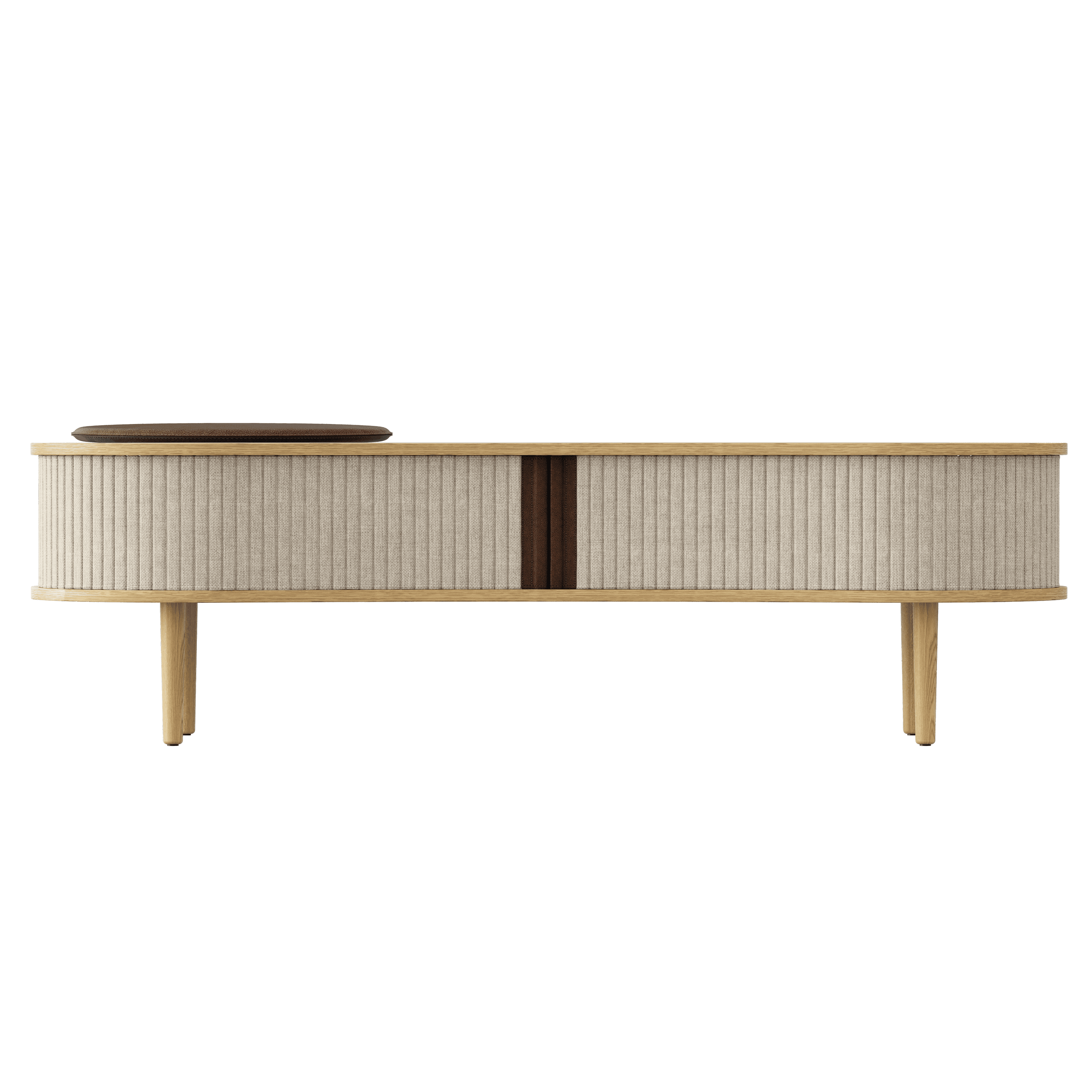 Available in three finishes - oak, dark oak and black oak - with blinds in four selected colors of Horizons fabric, 100% recycled. The blinds are replaceable, which allows you to easily refresh the appearance of the furniture without having to buy a new one, while saving natural resources. It is also possible to buy a seat cushion to increase comfort during use.