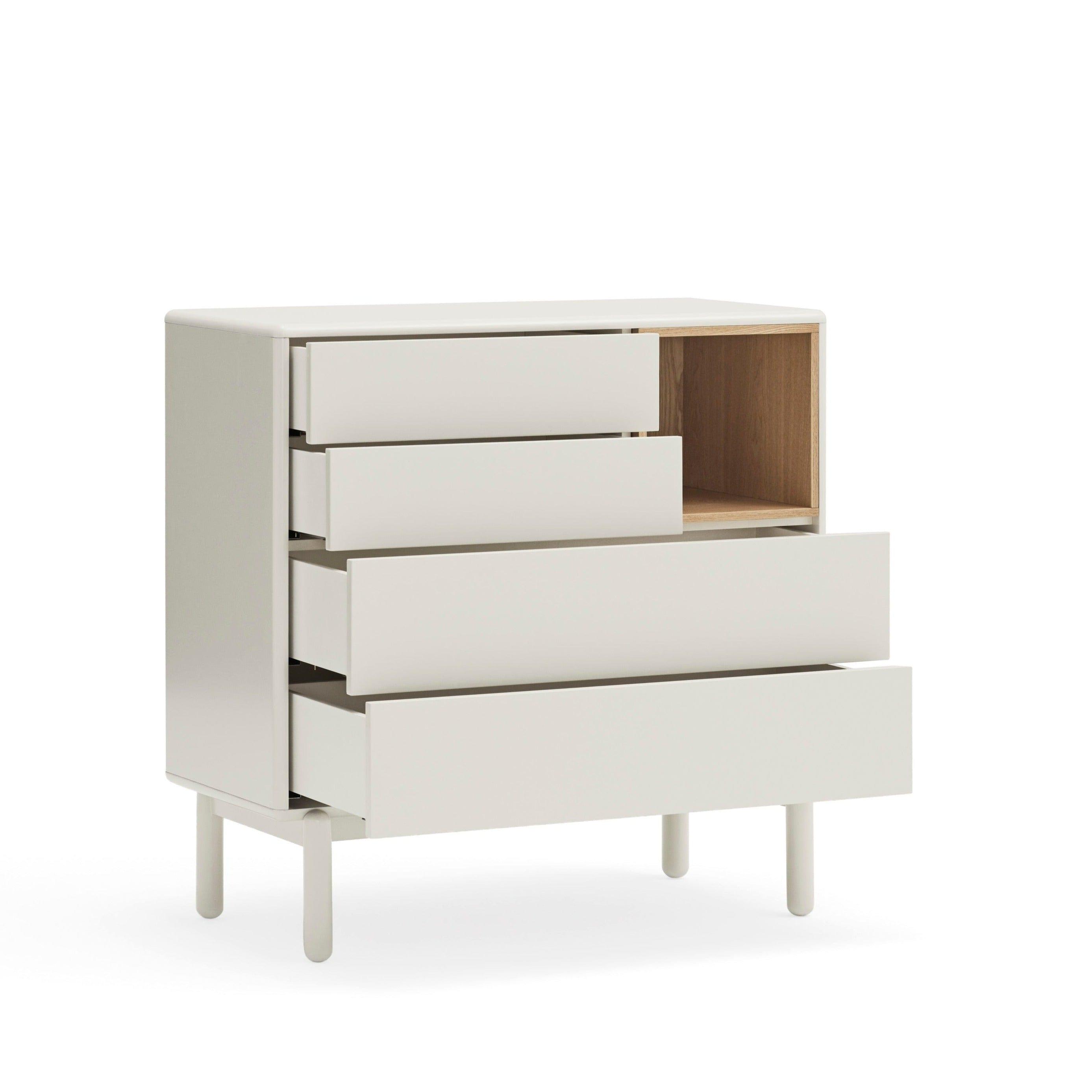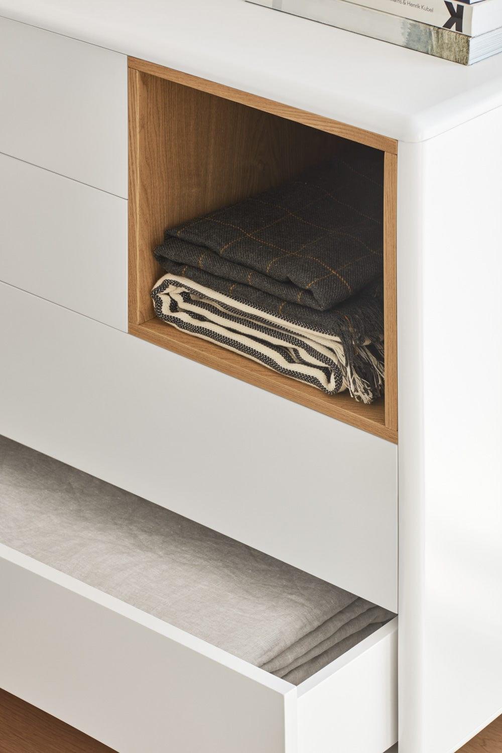 The use of closed drawers makes Corvo not only an aesthetic addition, but also a practical furniture. Wooden Details that stand out from the background of the cream color emphasize the character cabinets And they give her coziness.