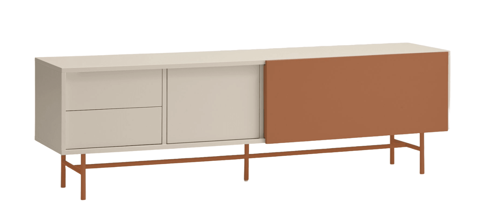 RTV cabinet with a unique cinnamon -beige color. The Nube collection is distinguished by an unusual and expressive configuration thanks to the sliding door, which can be freely set up, adapting to individual preferences. The way this door moves on the Nube RTV cabinet, revealing and hiding various parts of its interior, derives inspiration from the way the clouds move in the sky.