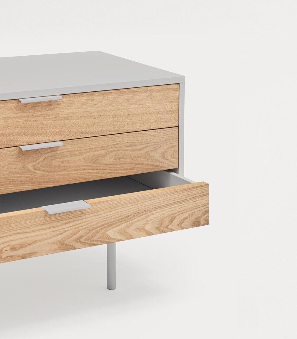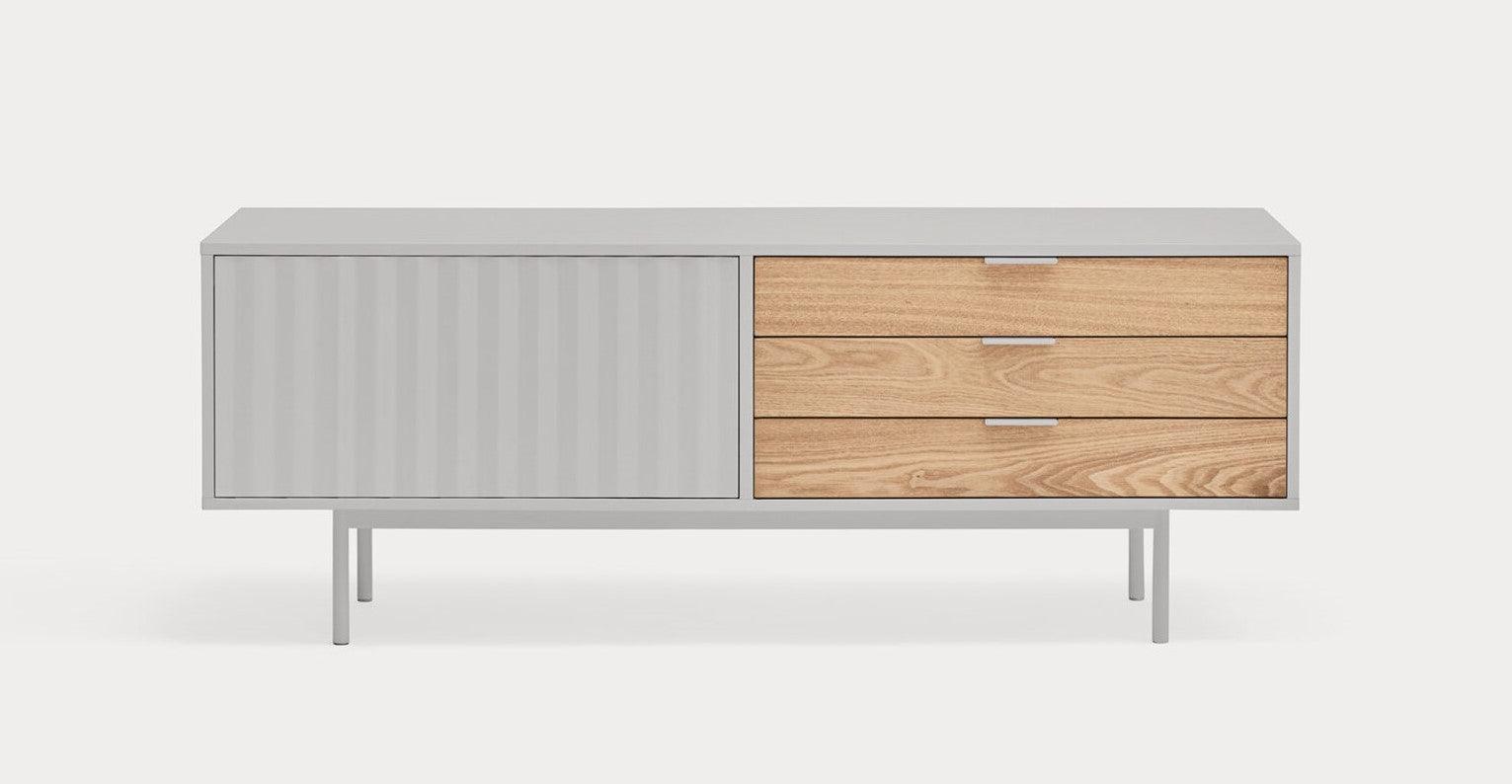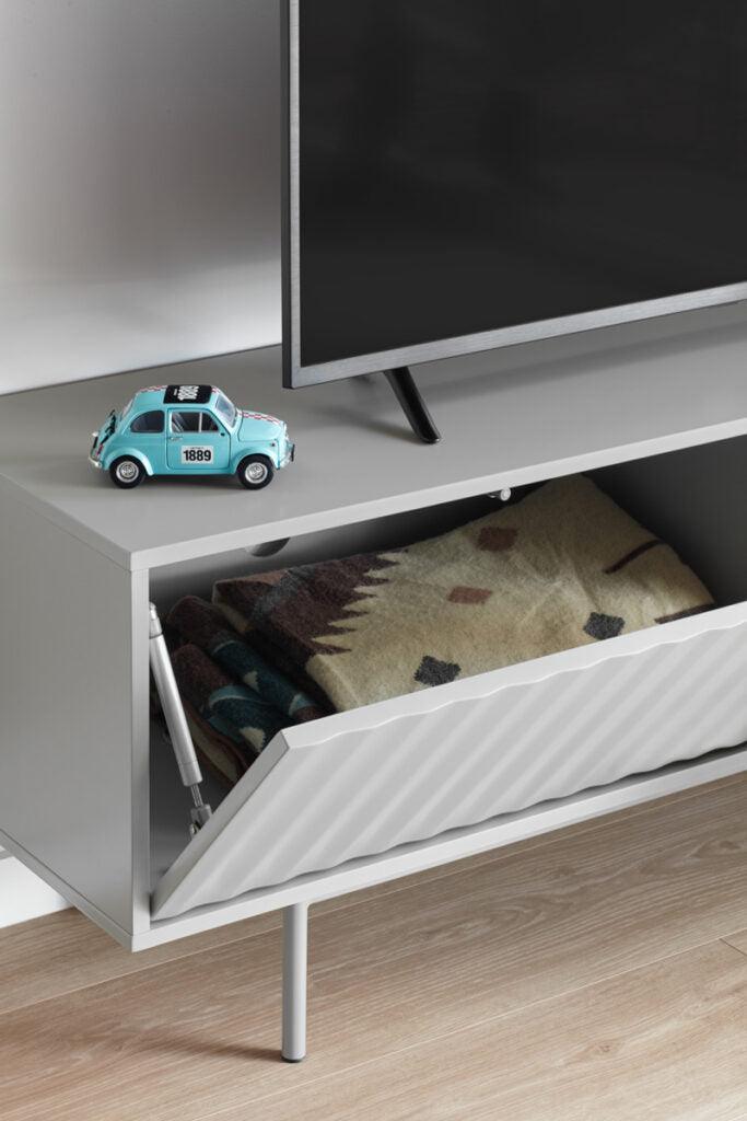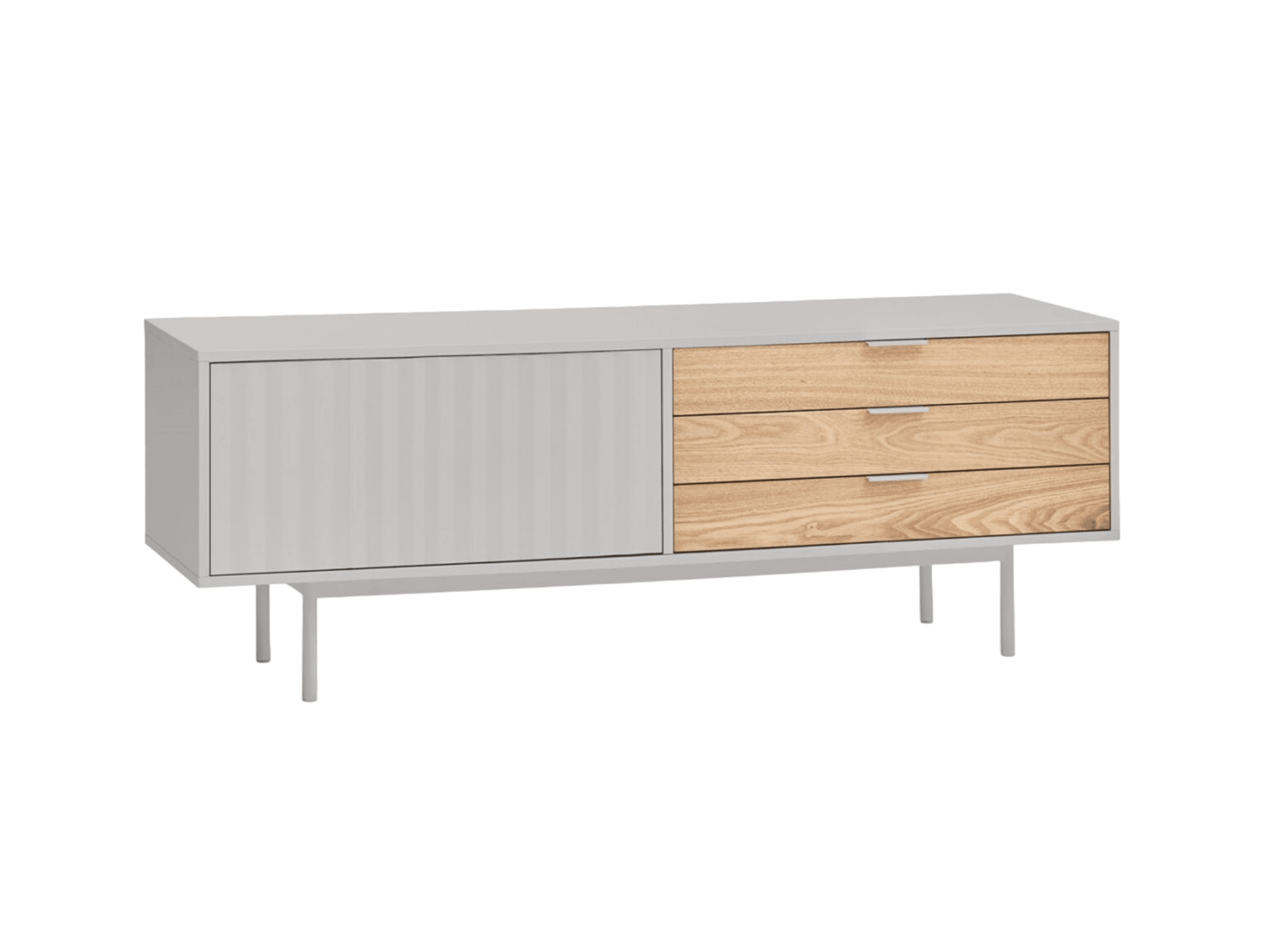 RTV cabinet with drawers Sierra in gray is a functional and elegant solution for your living room. It has a serrated door and three drawers made of natural wooden veneer that enable effective organization of space for storing various objects.