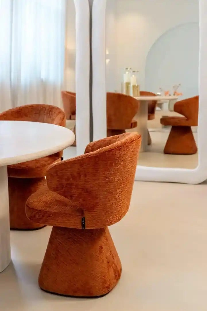 Elegant dining table Renaissance with a round top made of natural travertine is a combination of luxury and modern design. The thick top, 3.6 cm in thickness, is set on a stable, sculptural base made of iron and MDF, creating a harmonious and balanced form. The noble structure of the stone brings natural warmth and a unique character to the interior.