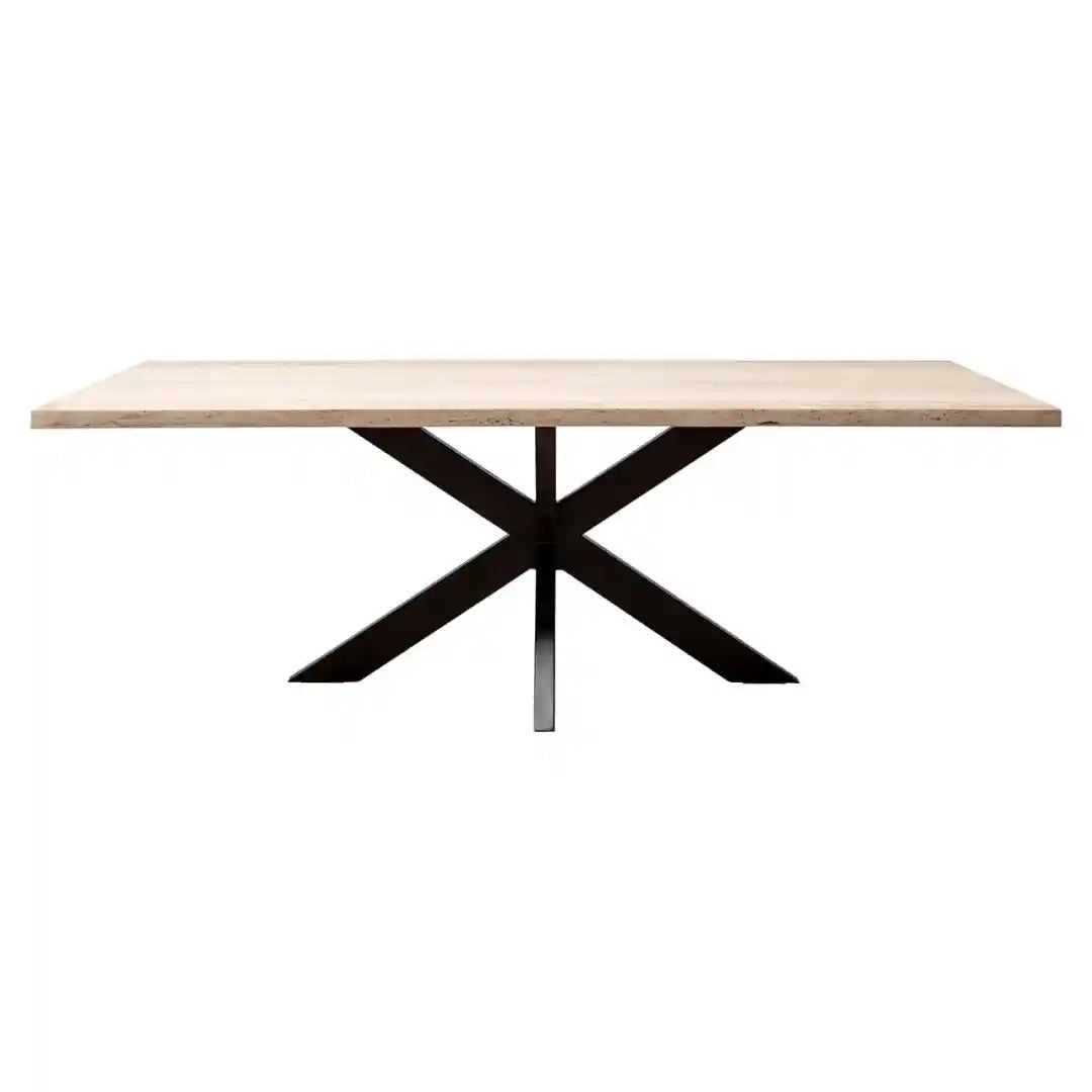 Elegant dining table Avalon with a rectangular travertine top is a combination of the natural beauty of stone and modern design. Its solid black iron base in a geometric construction gives the whole piece a unique character and stability. The natural pattern of the travertine makes each piece unique, and the table becomes a stunning centerpiece in any dining room.