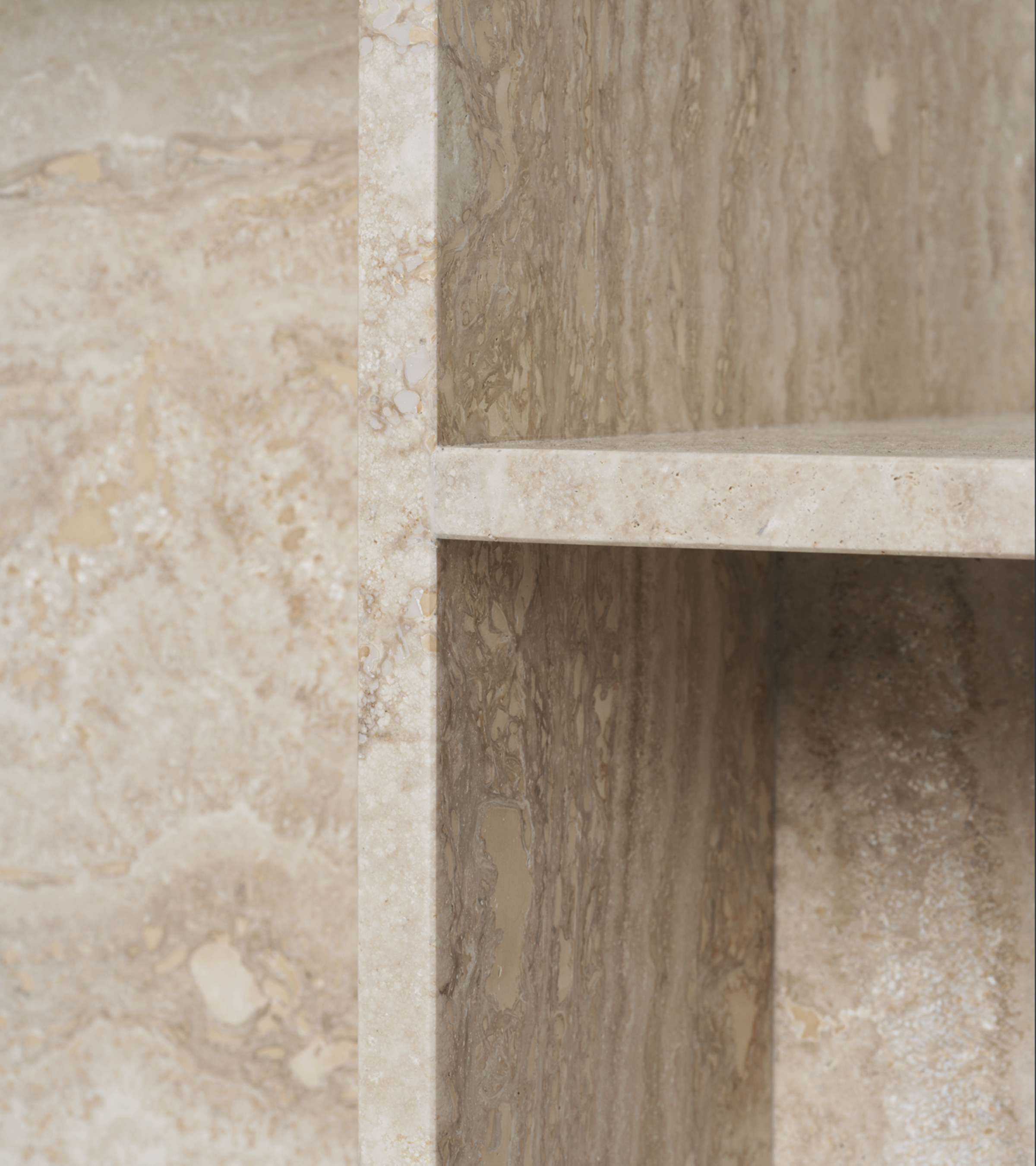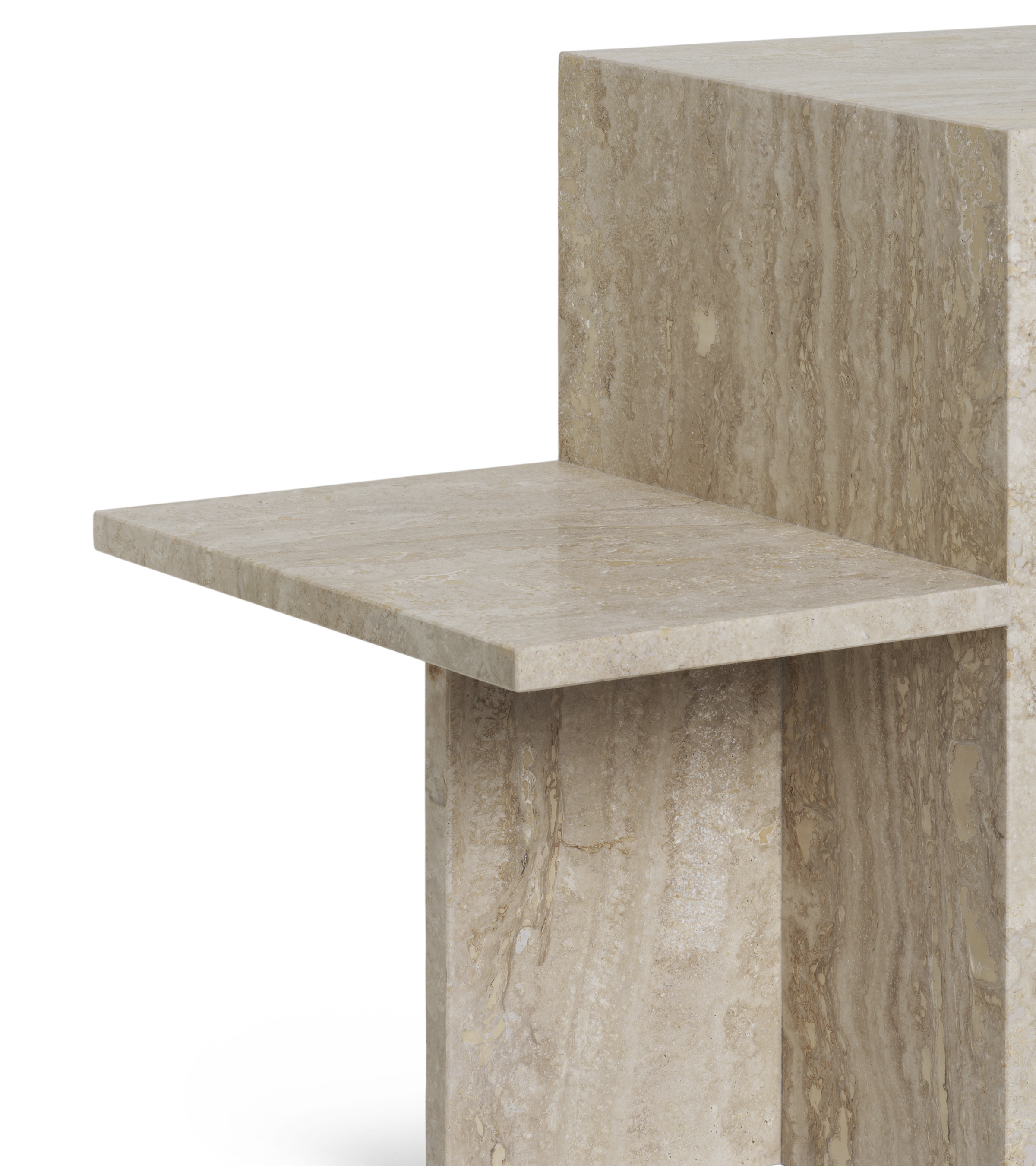 Inspired by Japanese minimalism, Distinct is a table with a sculptural form that explores the possibilities of building complex structures based on a single module. Its minimalist design contrasts with the rich texture of sand-colored travertine, highlighting the rawness and naturalness of the stone. Each piece is unique – with variations arising from the natural properties of the material.