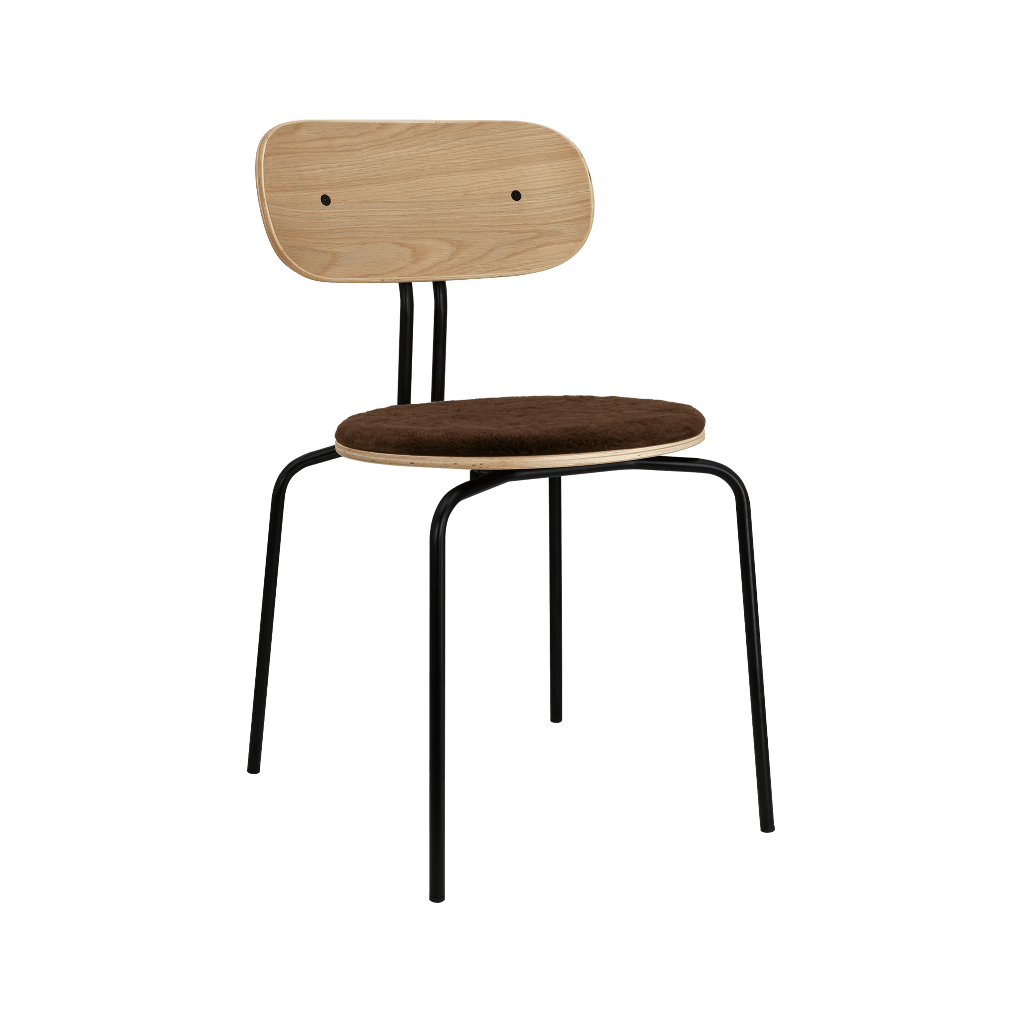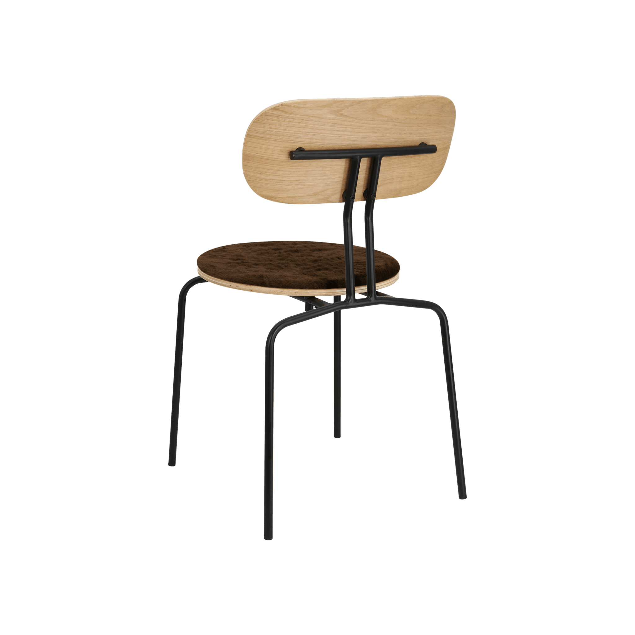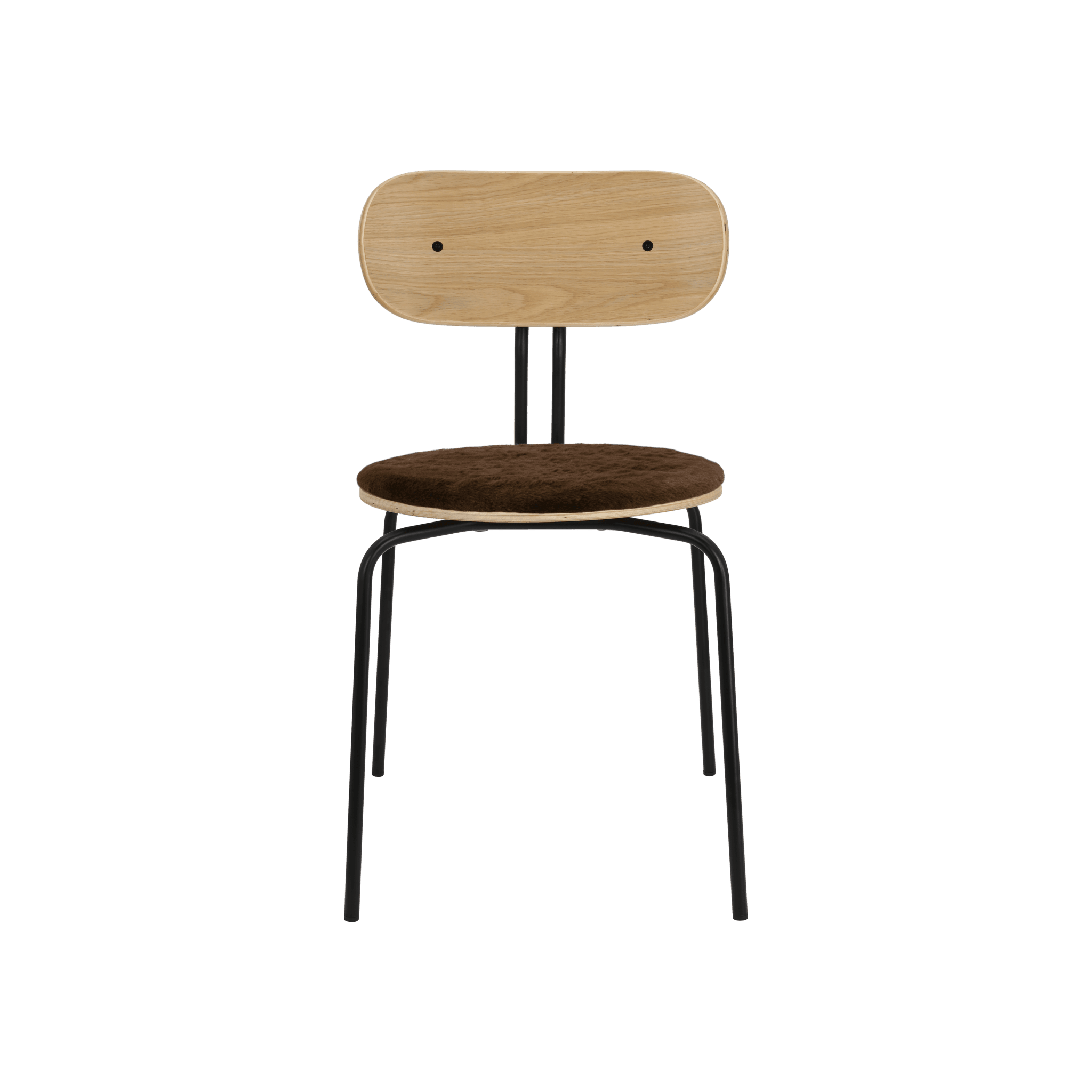 Chair Curious is elegant, light and minimalist furniture, made of oak veneer. It is available with brass or black legs, and the optional seat cushion provides additional comfort. You can choose a pillow from 17 colors of Horizons fabric, made 100% recycled, as well as in a brown or white shade of Teddy Bear fabric.