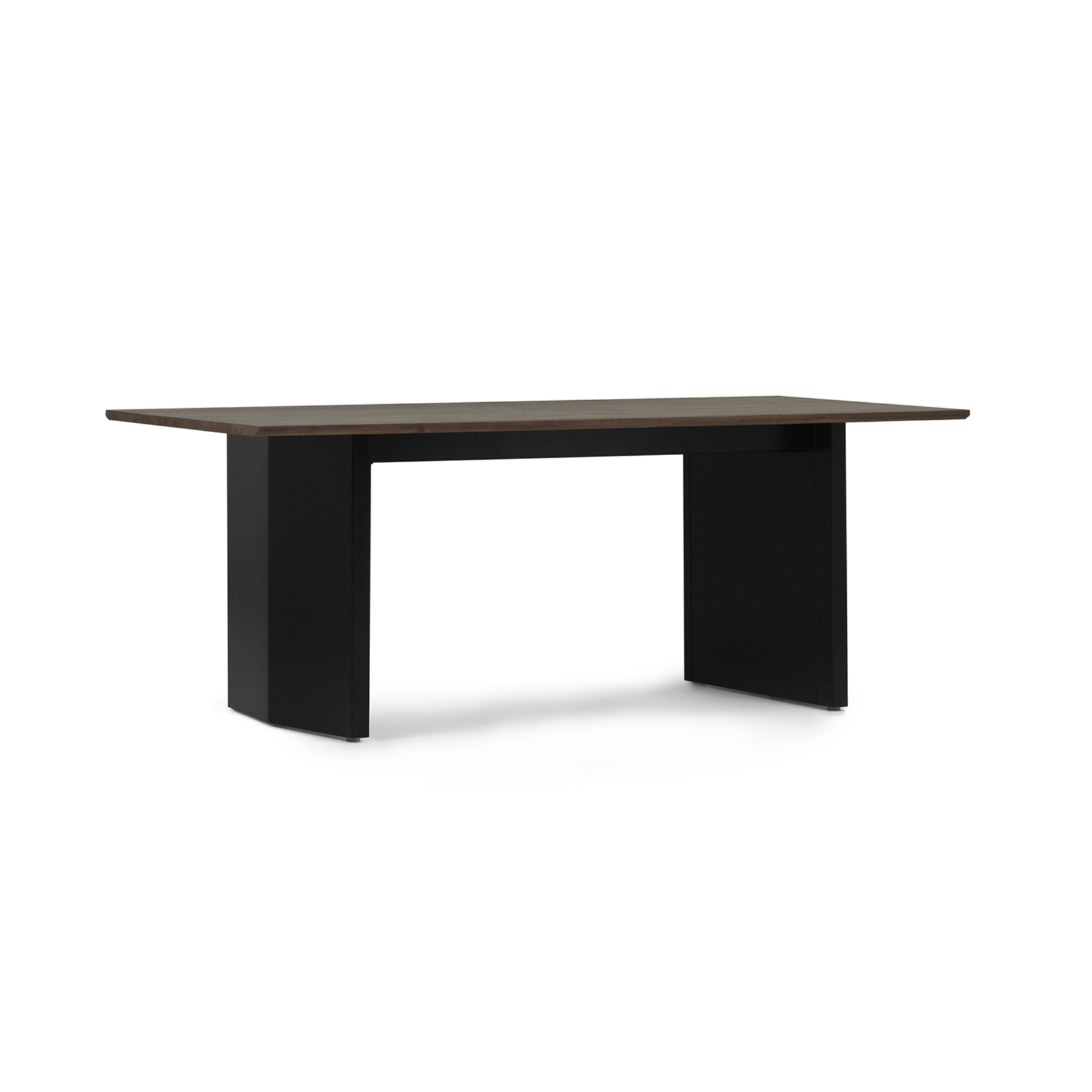 The table top is made of pine -certified pine, covered with dark brown stain and matte protective varnish, which emphasizes the natural beauty of wood. It rests on two powder -painted steel bases, connected by a steel beam for additional stability. Both the top and legs have been subtly cut at an angle, which gives the whole an elegant character. The panel is an ideal combination of functionality and aesthetics that goes perfectly in modern and classic interiors.