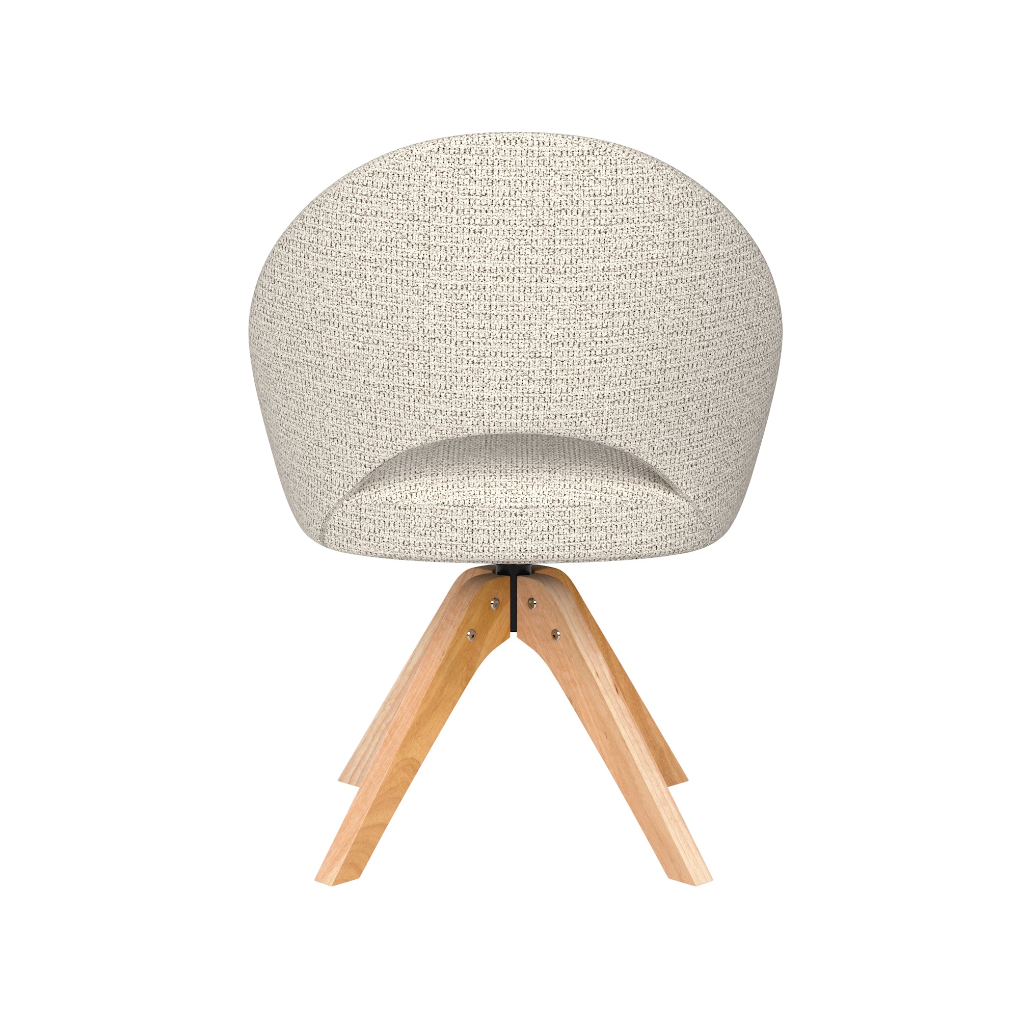 Upholstered chair is the perfect combination of modern aesthetics and functionality. With its rounded backrest and elegant swivel base made of light-colored wood, it fits perfectly into current interior design trends. The soft seat and ergonomic shape ensure comfort for everyday use, whether at the dining table, in the office space, or in the living room.