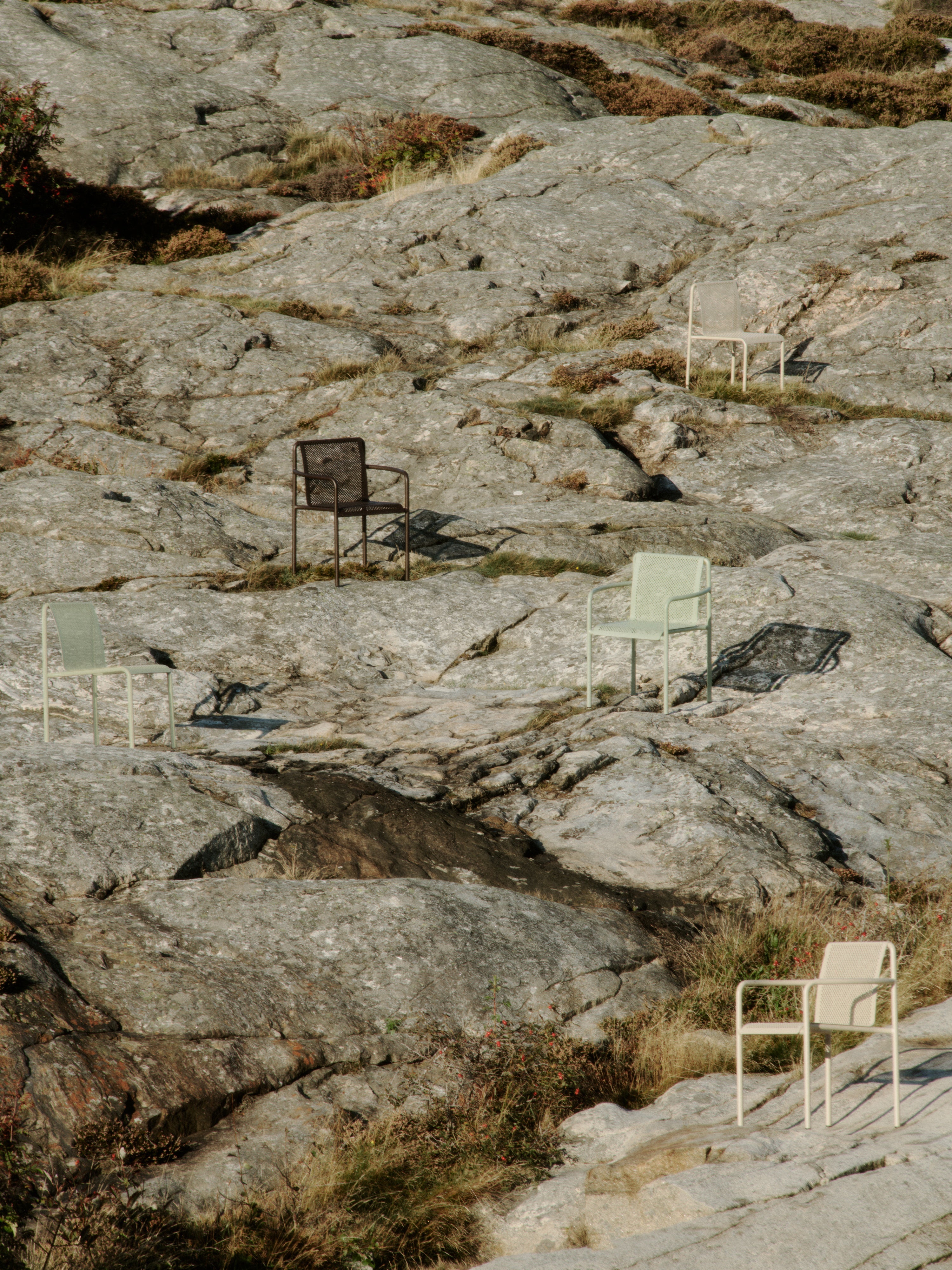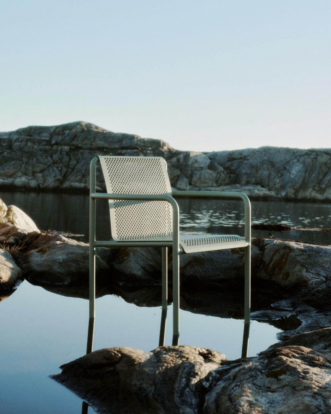 Chair Dapple is a stylish combination of functionality and subtle design inspired by the play of light and shadow. The perforated surface reminiscent of light filtering through leaves adds lightness and elegance while preventing water accumulation. Thanks to the galvanized steel with a powder coating, the chair is weather-resistant – perfect for use on a terrace, balcony, or in the garden.