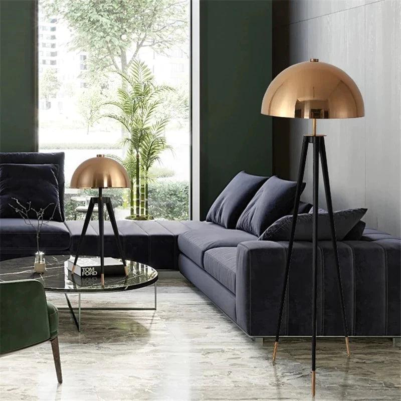 Floor lamp Coyote is the quintessence of the Mid-Centure Modern style, which adds a cozy atmosphere to any room and a sophisticated design. The golden finish of the dome lampshade gives the lamp elegance, while black narrowed legs with brass covers introduce a subtle contrast, creating a harmonious and modern whole.