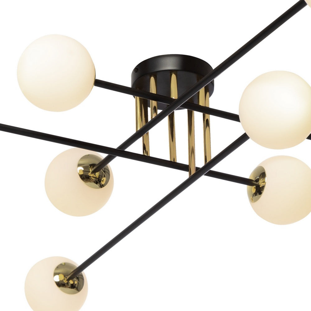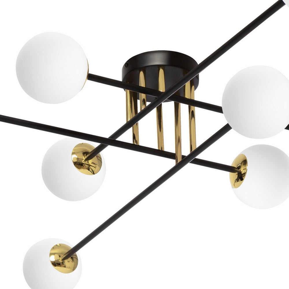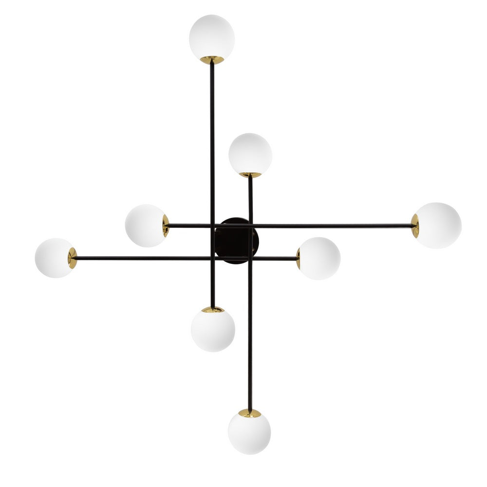 Ceiling lamp Astra 8 is a design inspired by the glow and mysterious character of star constellations. Designed for spaces with low ceilings, it is perfect for areas where impressive yet low ceiling lighting is needed. It stands just 20 cm tall, and the eight glass, spherical shades made of frosted glass, placed at the ends of four asymmetrical arms, emit a pleasant, soft, and diffused light.