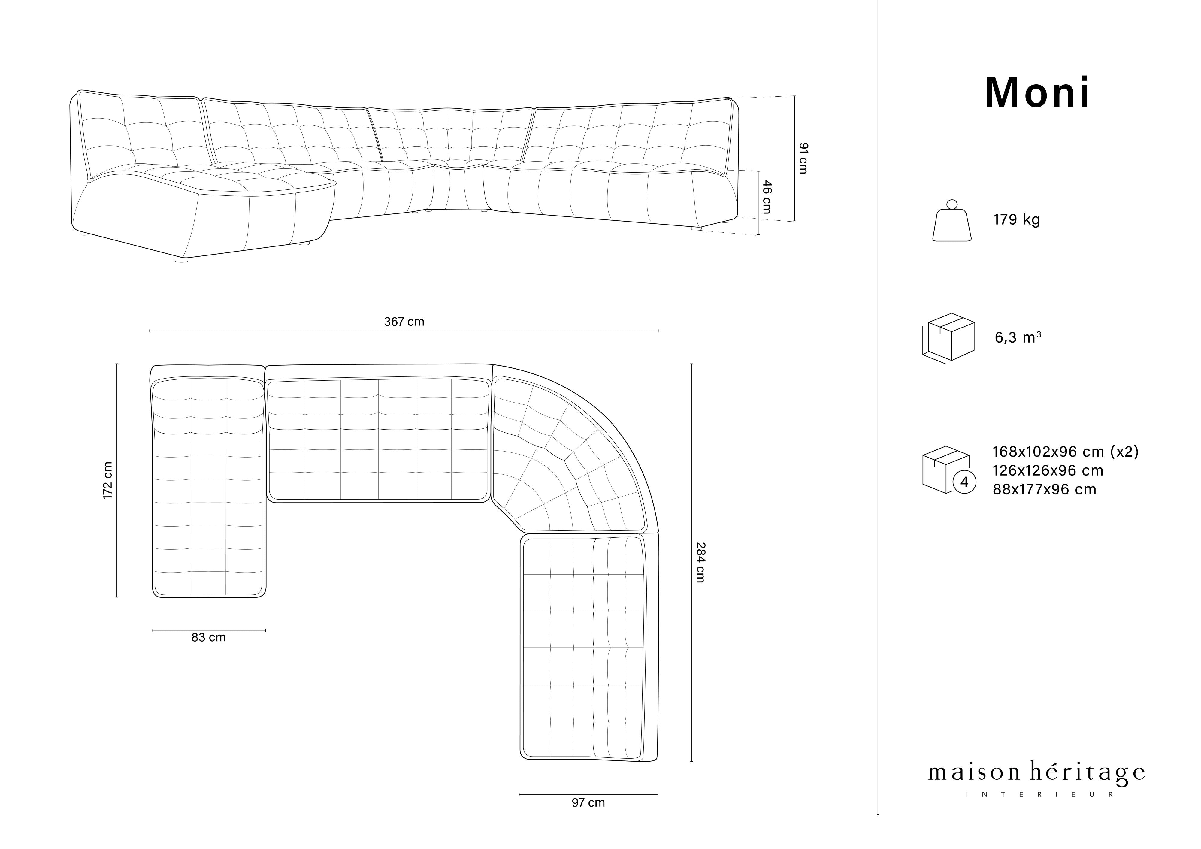 The upholstery made of natural cowhide is gently pressed, thanks to which its structure is very pleasant to the touch. Ergonomic shapes ensure free support. The Moni collection includes several combinations of sofas and corners, as well as elements such as armchairs, chaise and poufs.