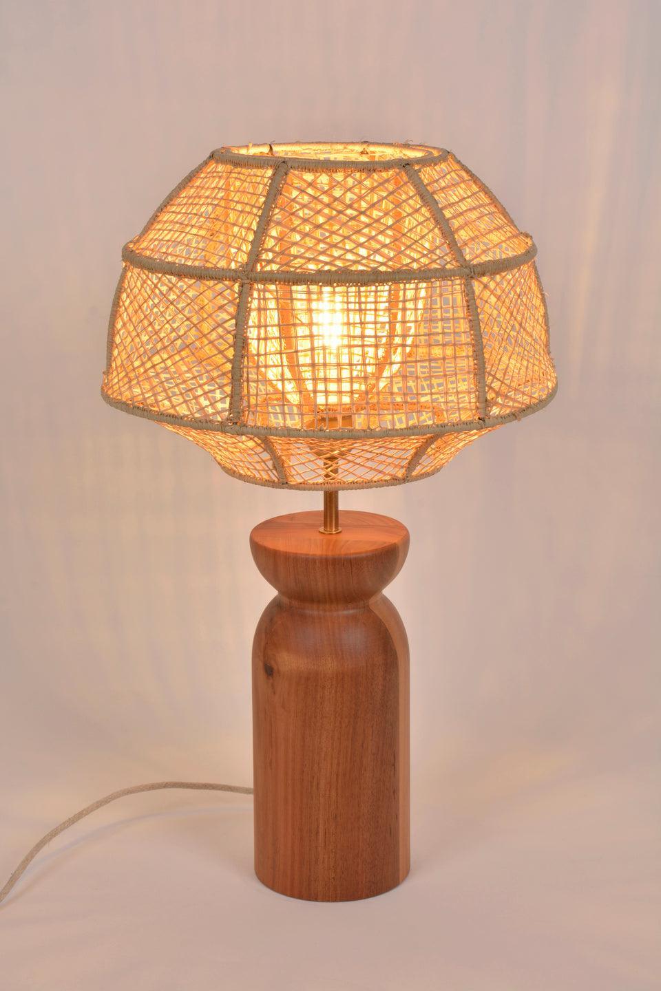 Table lamp Odyssee is a unique element made of solid wood. Her lampshade takes the form of a dome made of hand -woven natural rafia. It is equipped with a textile cable with a built -in switch.