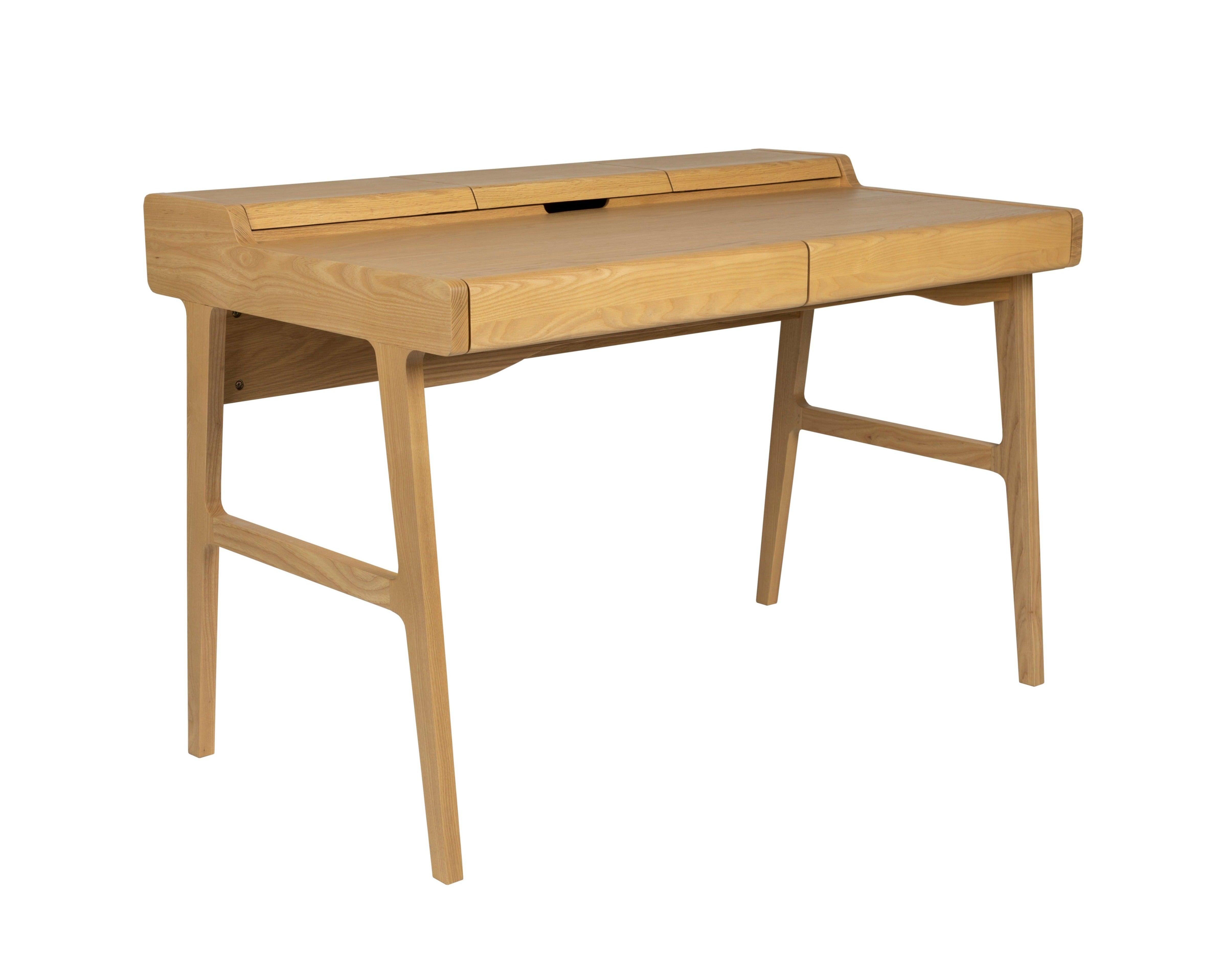 Desk Kaat is made of oak veneer and rubber wood with a natural finish. Kaat has a lot of built -in storage space, with three shelves at the top and two drawers inside. The middle shelf at the top has built -in holes for hiding and organizing cables.
