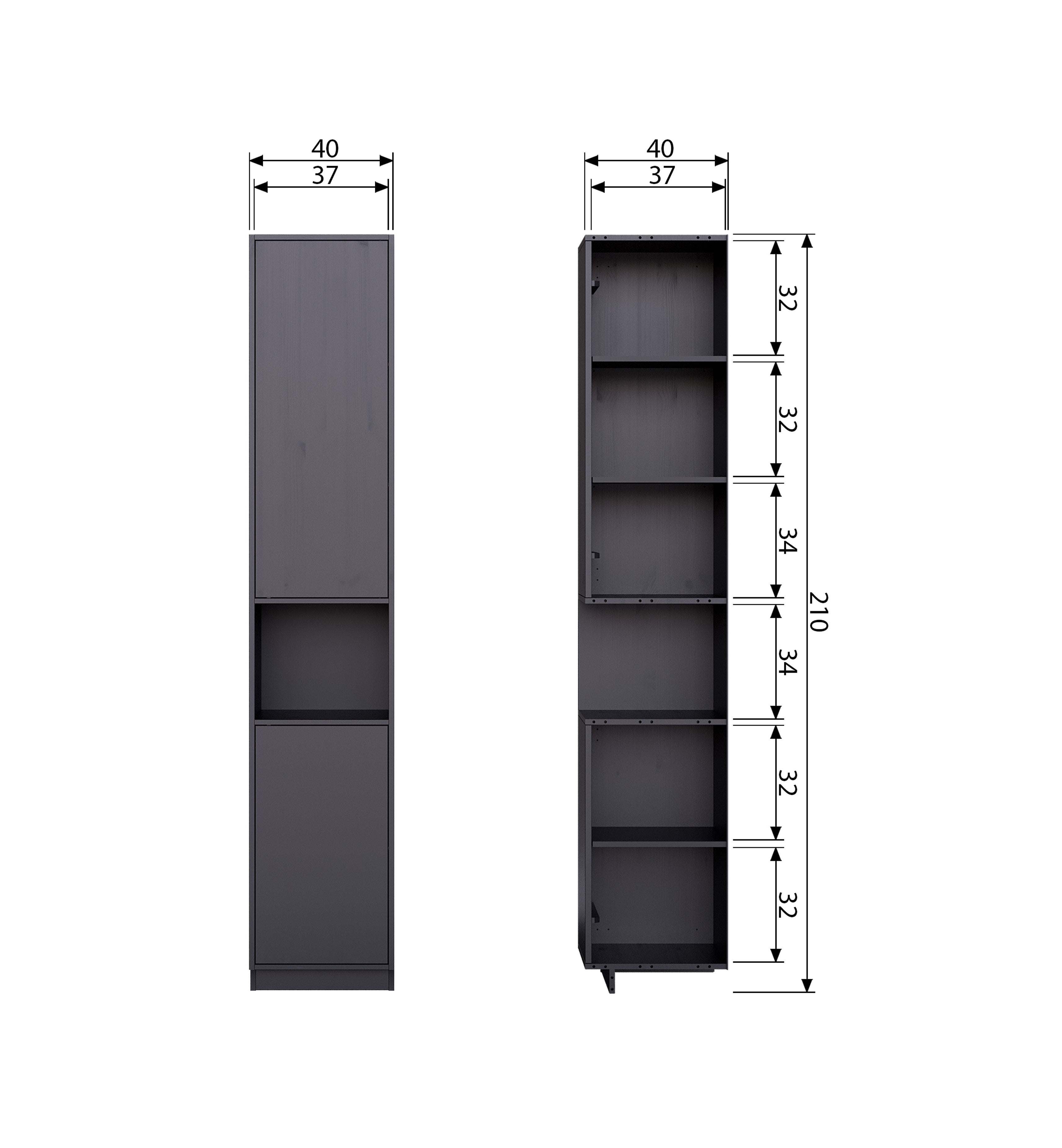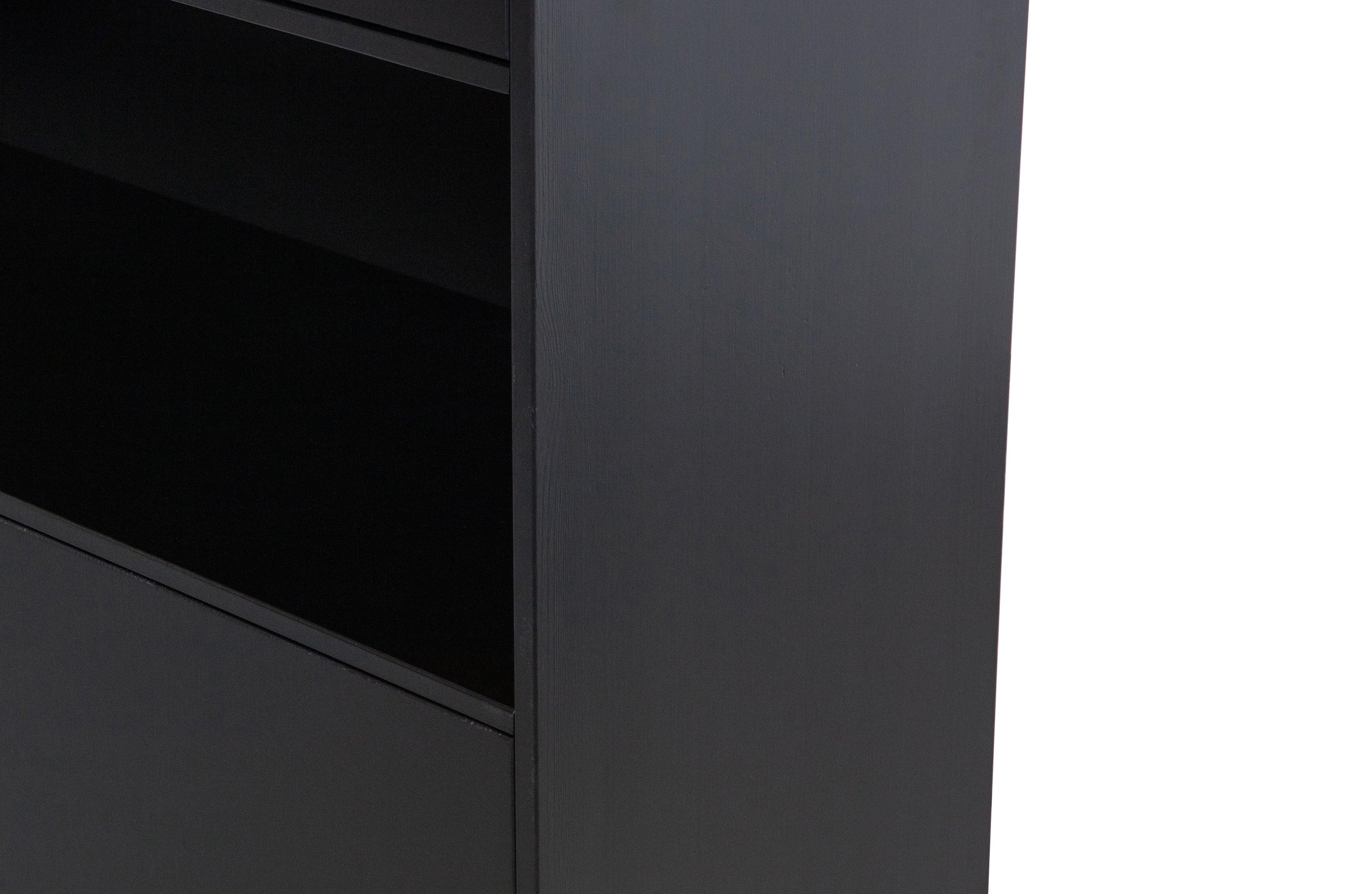 Rack The fiana was made of certified pine wood and finished in deep black. This unique piece of furniture combines open and closed compartments, creating a stylish whole, while offering a lot of space for storing the most beautiful accessories.
