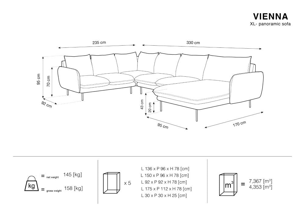 Narożnik panoramiczny Vienna wyróżniają piękne proporcje i harmonijne kształty. Narożnik do salonu jest nie tylko wygodny, ale też wprowadzi do wnętrza nutę paryskiego szyku i elegancji. Subtelna forma i miękkie siedzisko zapewnią niezwykły komfort użytkowania. Metalowe nogi nadają całej formie lekkości.
