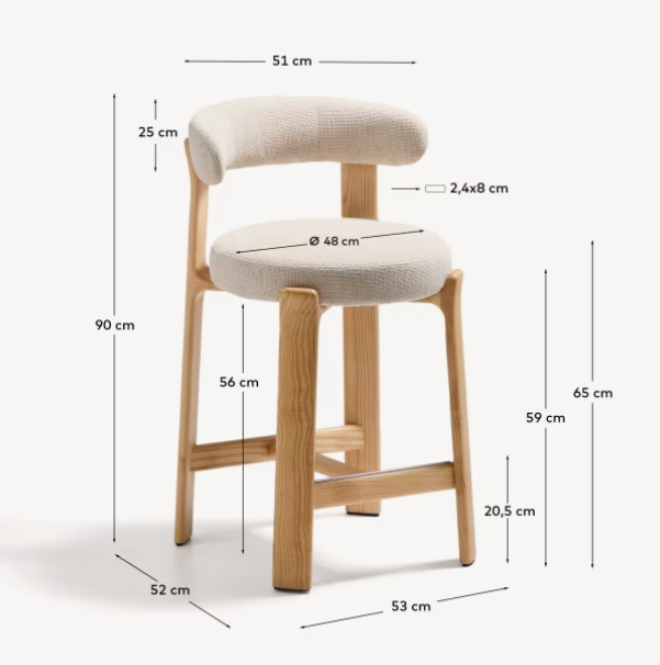 The upholstered seat and backrest are covered with a soft chenille fabric in shades of beige, creating a striking contrast with the wood. The material is not only pleasant to the touch but also exceptionally durable and environmentally friendly – made partially from recycled fibers. The entire piece is designed with comfort in mind – the comfortable seat, well-shaped backrest, and appropriate height make the Granite perfect for a kitchen island or high table. It is a piece of furniture that not only looks beautiful but also brings warmth, lightness, and stylish balance to the interior. Ideal for lovers of good design and natural materials.
