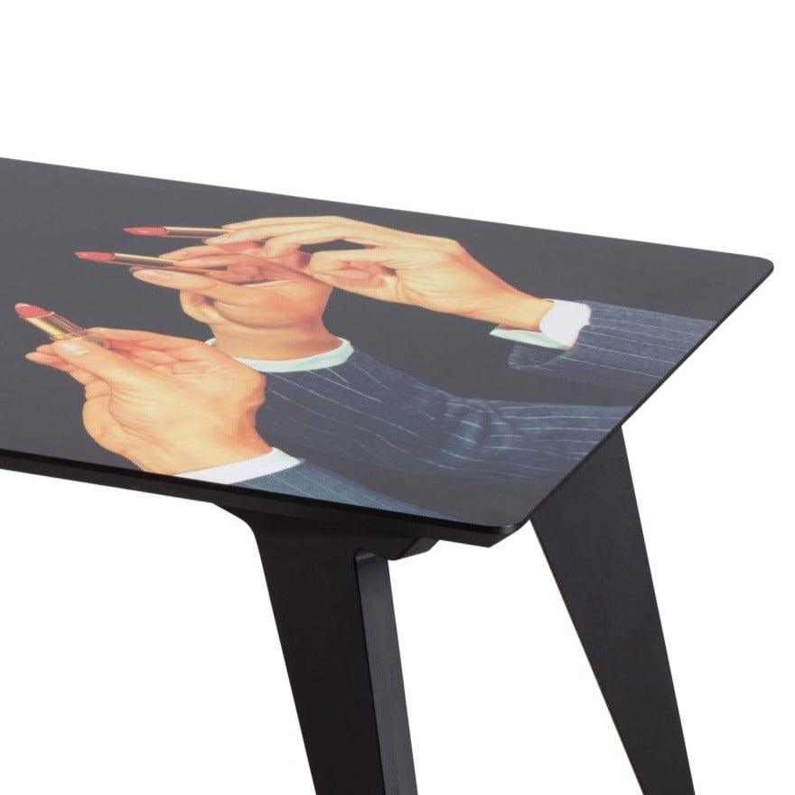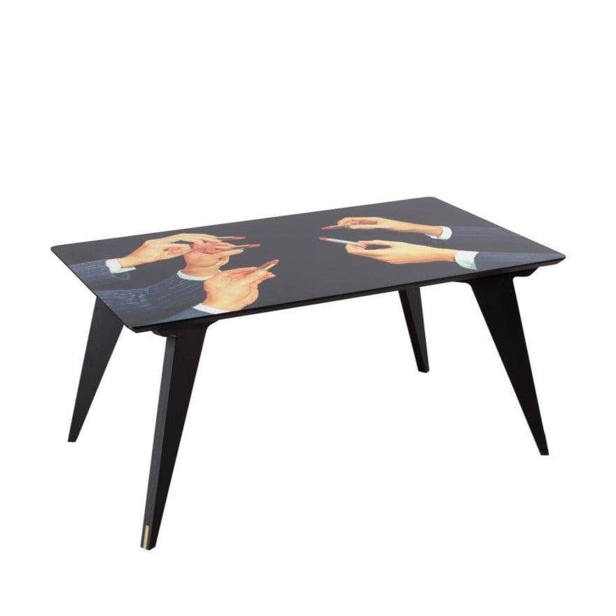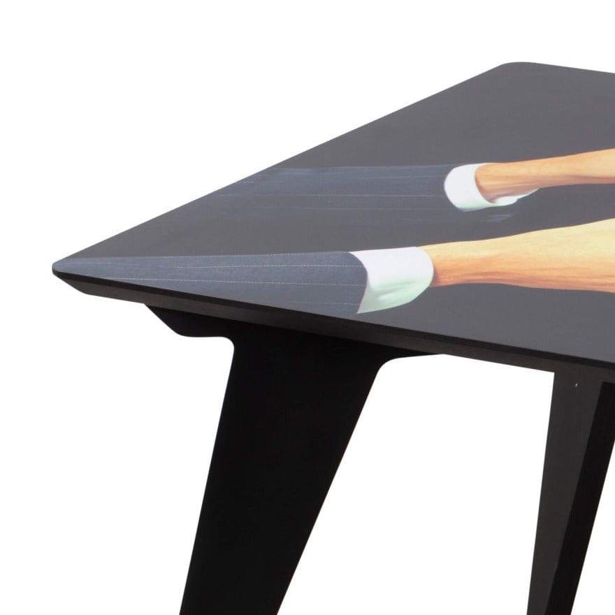 Designer table in the style of the 70s, which Like a gate to another, surreal dimension, it will give the interior a unique character. Distitory legs and a slightly controversial collage on the top create an original work of art. Stayed inConsciently in Italy, which guarantees high quality.