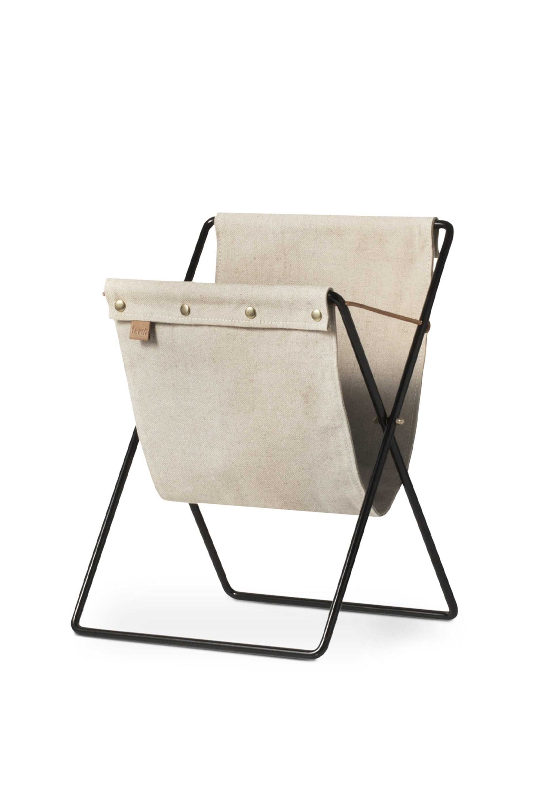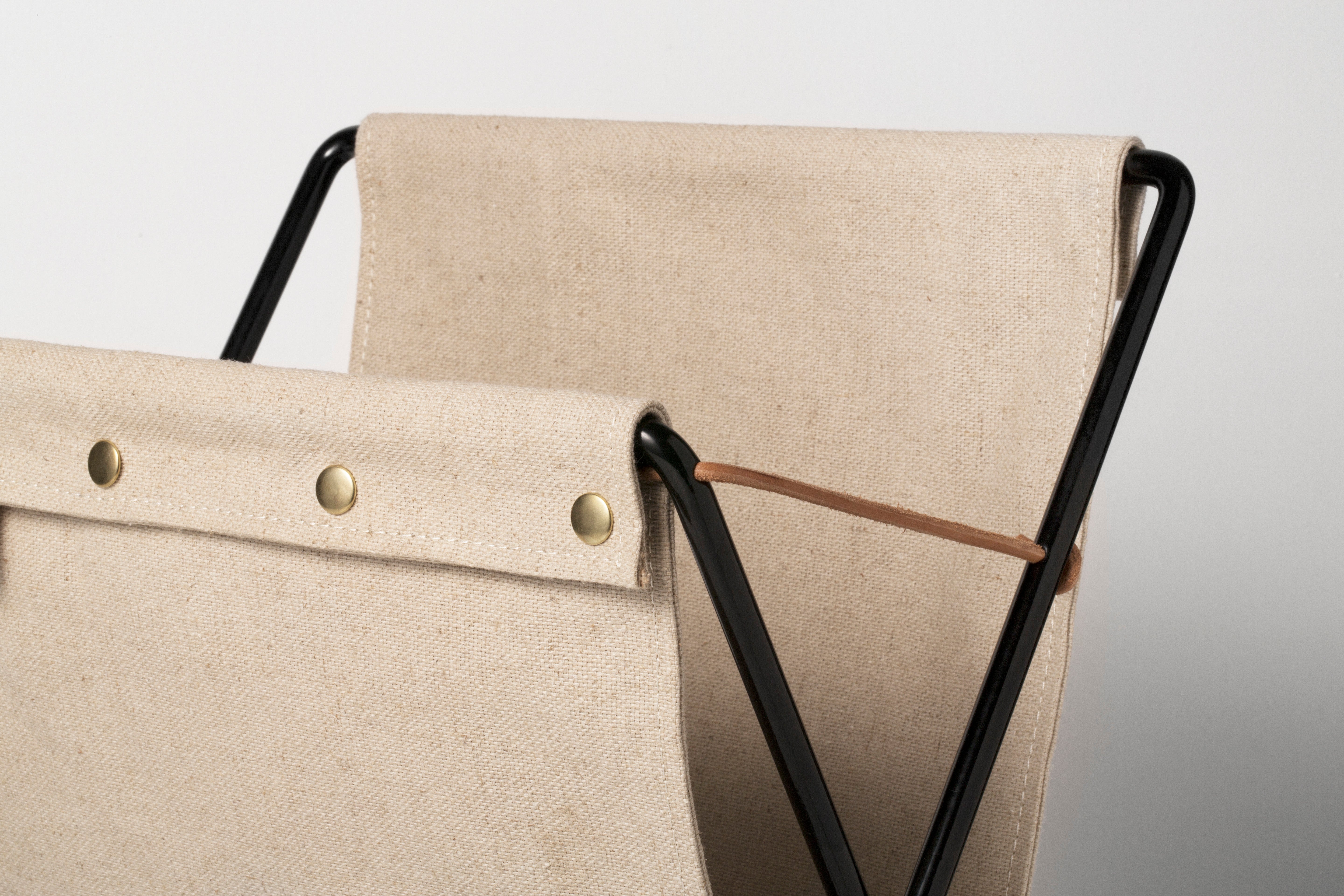 Herman Magazine Rack is a blend of timeless design and functionality. Inspired by retro aesthetics, it is crafted from durable cotton canvas that hugs a sturdy powder-coated metal frame. Leather bindings and brass details, including fasteners and the logo, add a unique character to the piece.