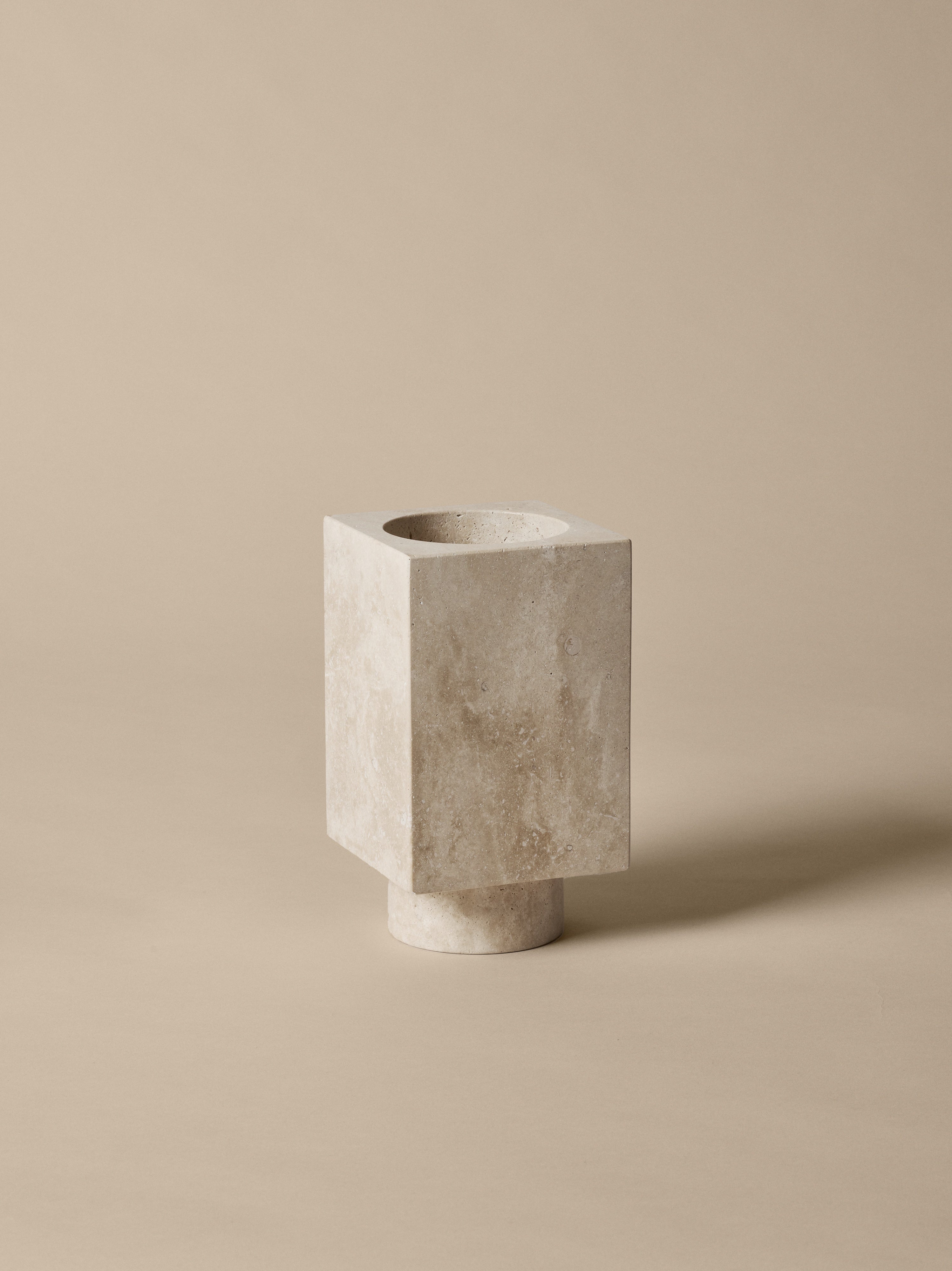 Thanks to its monolithic form and natural finish, the Hew vase works wonderfully as both a standalone decorative accent and an elegant setting for single flowers. Each piece is unique due to the natural variations in the structure of the travertine.