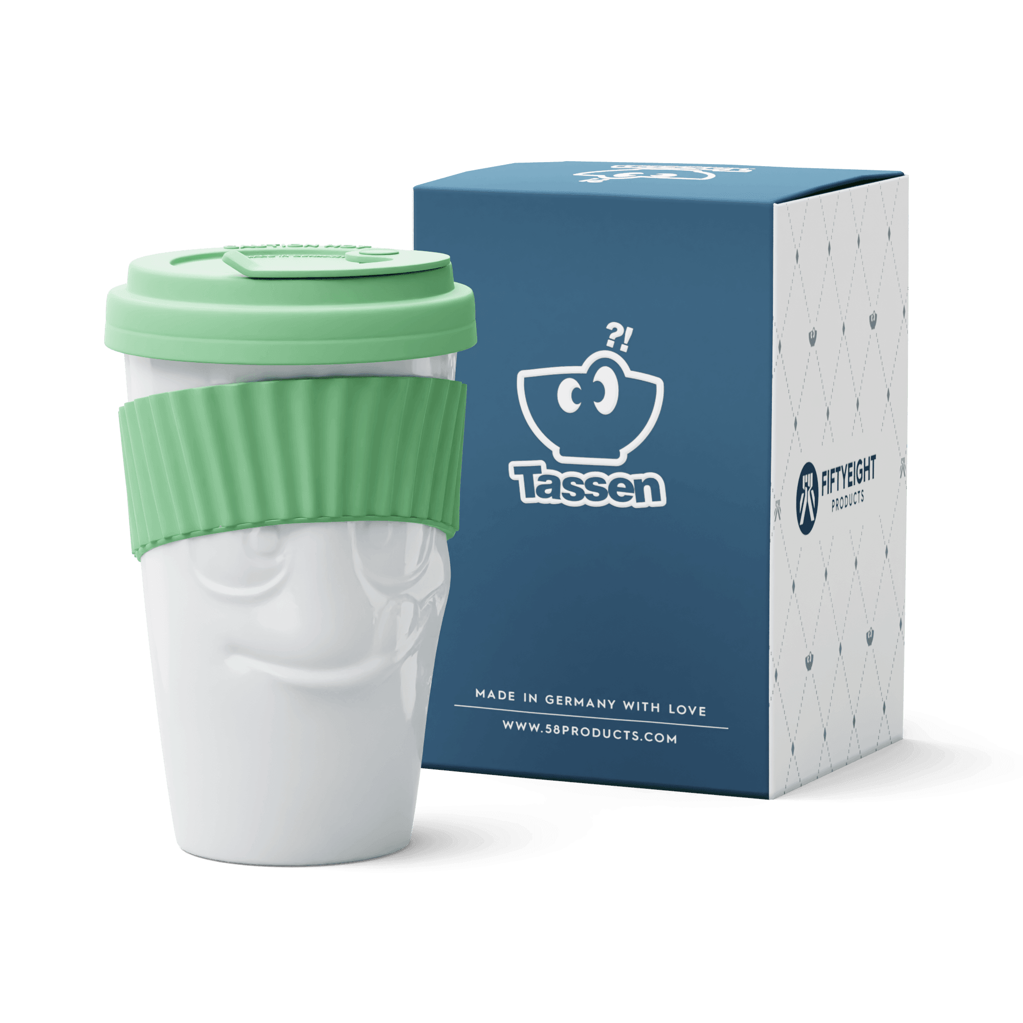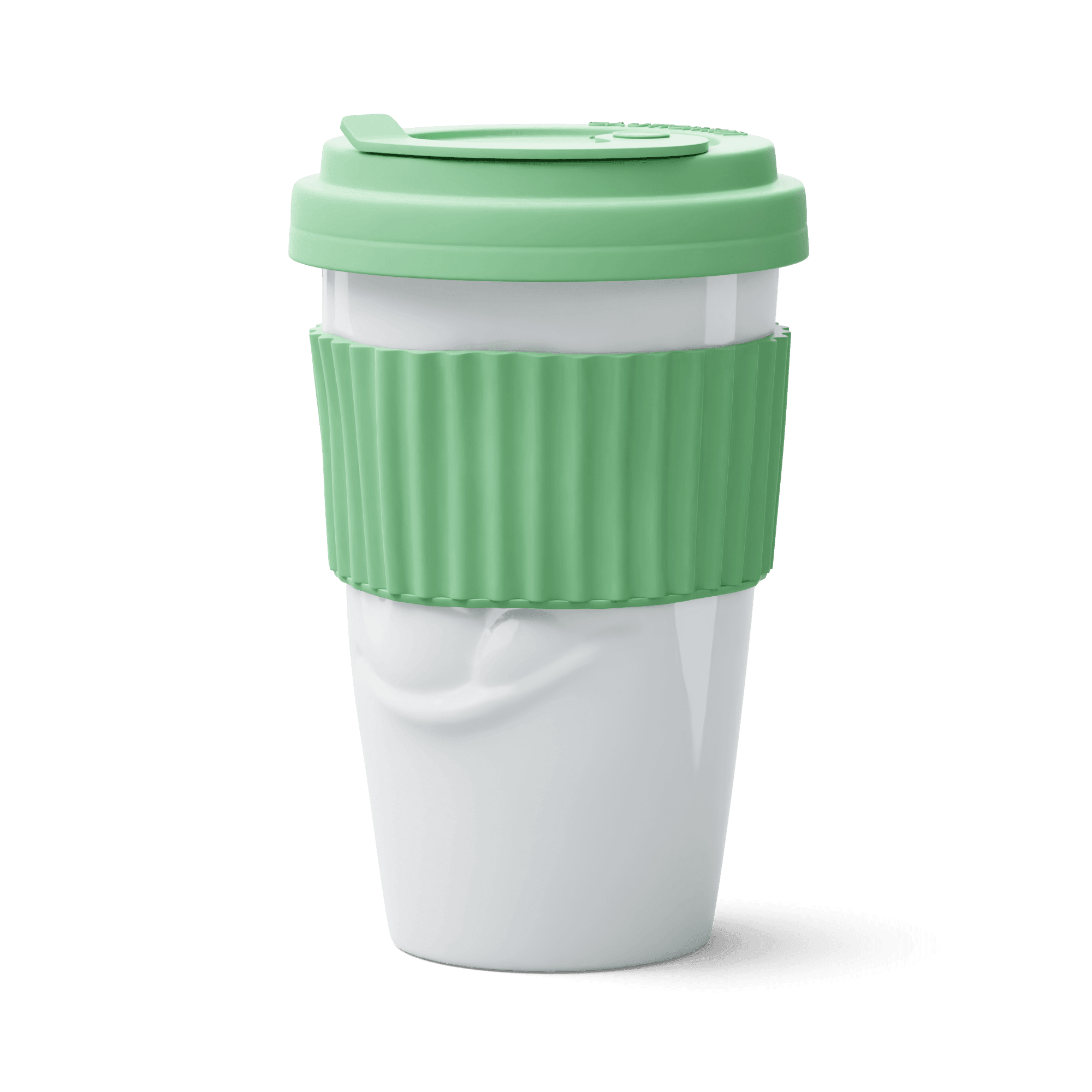 Cup with lid Tasty in white with a delicate mint accent is a practical dish that impresses with a hunger grimace. This cup is an ideal travel companion.