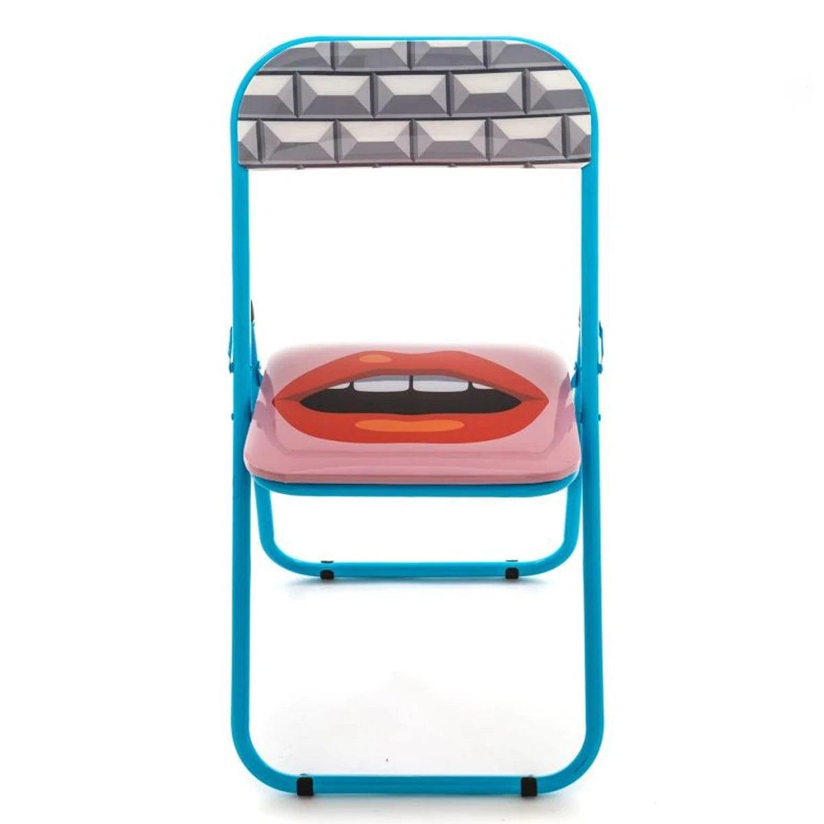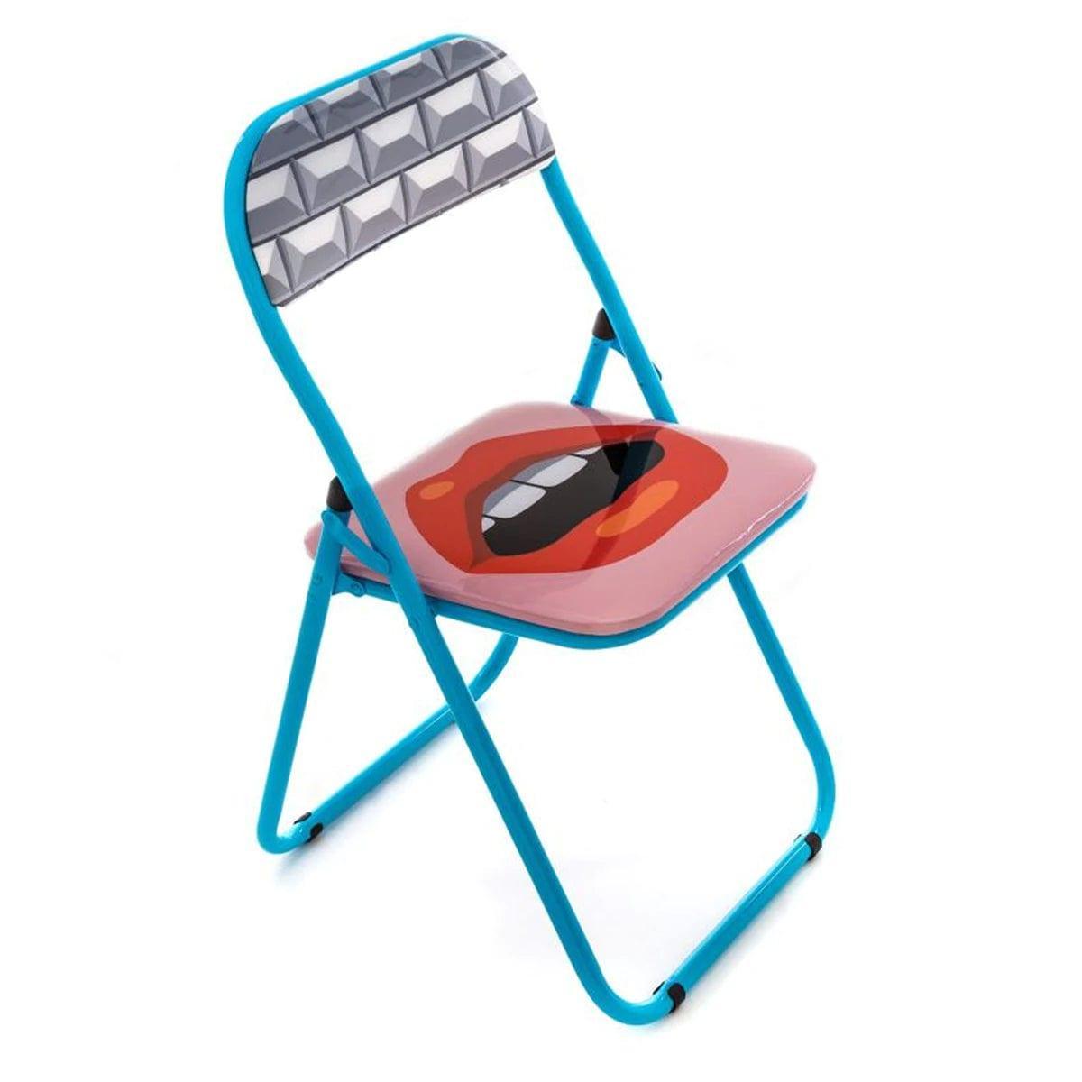 Designer folding chair In the style of pop art, it will give the interior a bit surreal and funny character. The whole is made of metal, and the dynamism full of dynamism and a slightly controversial collage create an original work of art.
