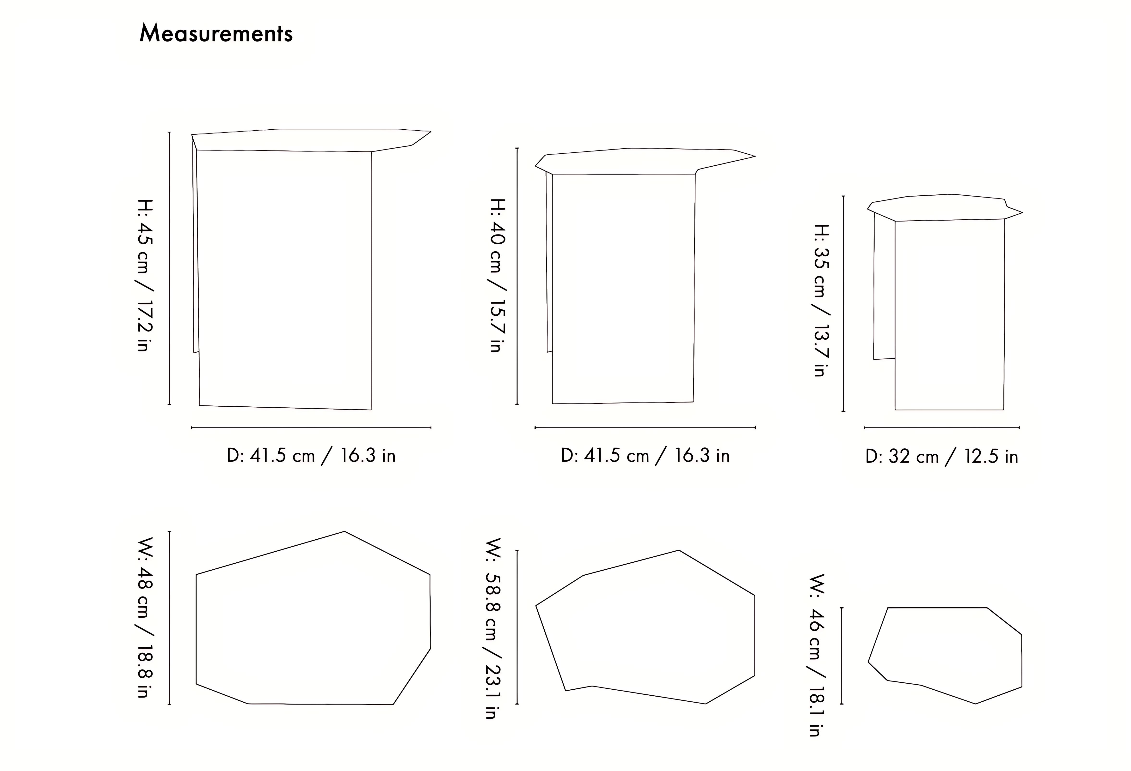 Shard tables are a bold fusion of elegance and raw beauty, inspired by the sharp, irregular edges of broken pieces of ceramics, glass, and stones. These tables introduce a dynamic accent to the interior, combining functionality with unique design. They can be stacked on top of each other for a sleek, tidy appearance, or arranged in different locations to create an intriguing, spatial layout.