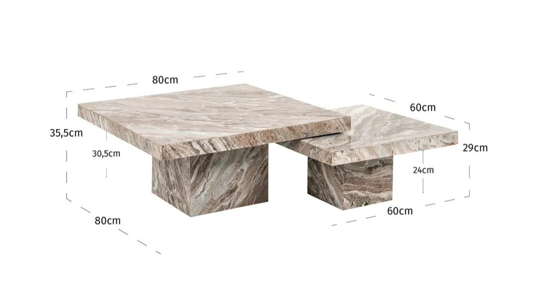 Impressive coffee table set Rashford made entirely of natural Toronto marble is a sophisticated interior design element that impresses with its solidity and elegance. The square top, 5 cm thick, is supported by a massive, geometric base, giving the furniture a sculptural character. The subtle palette of beiges and grays, characteristic of Toronto stone, brings a sense of luxury and natural harmony to the interior.