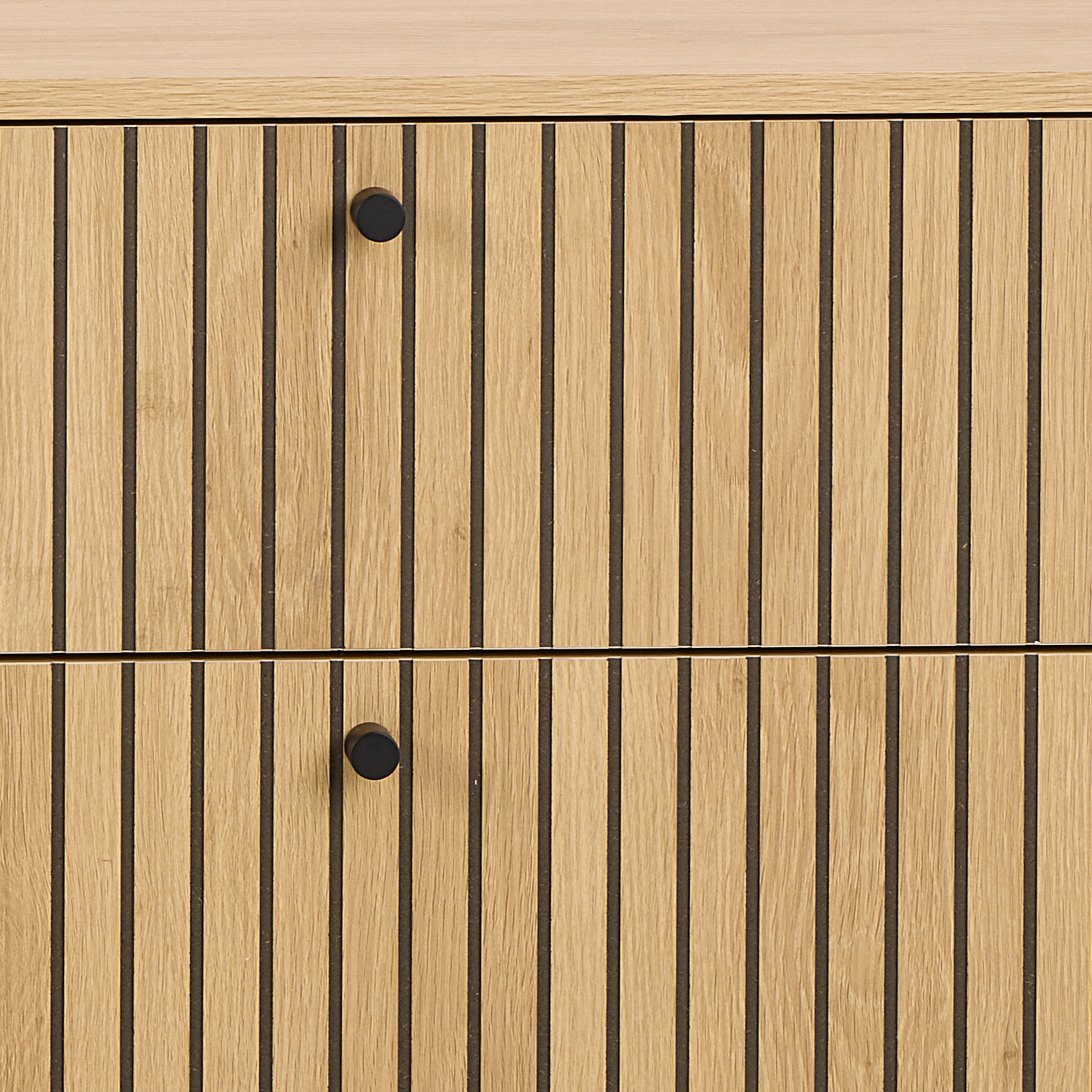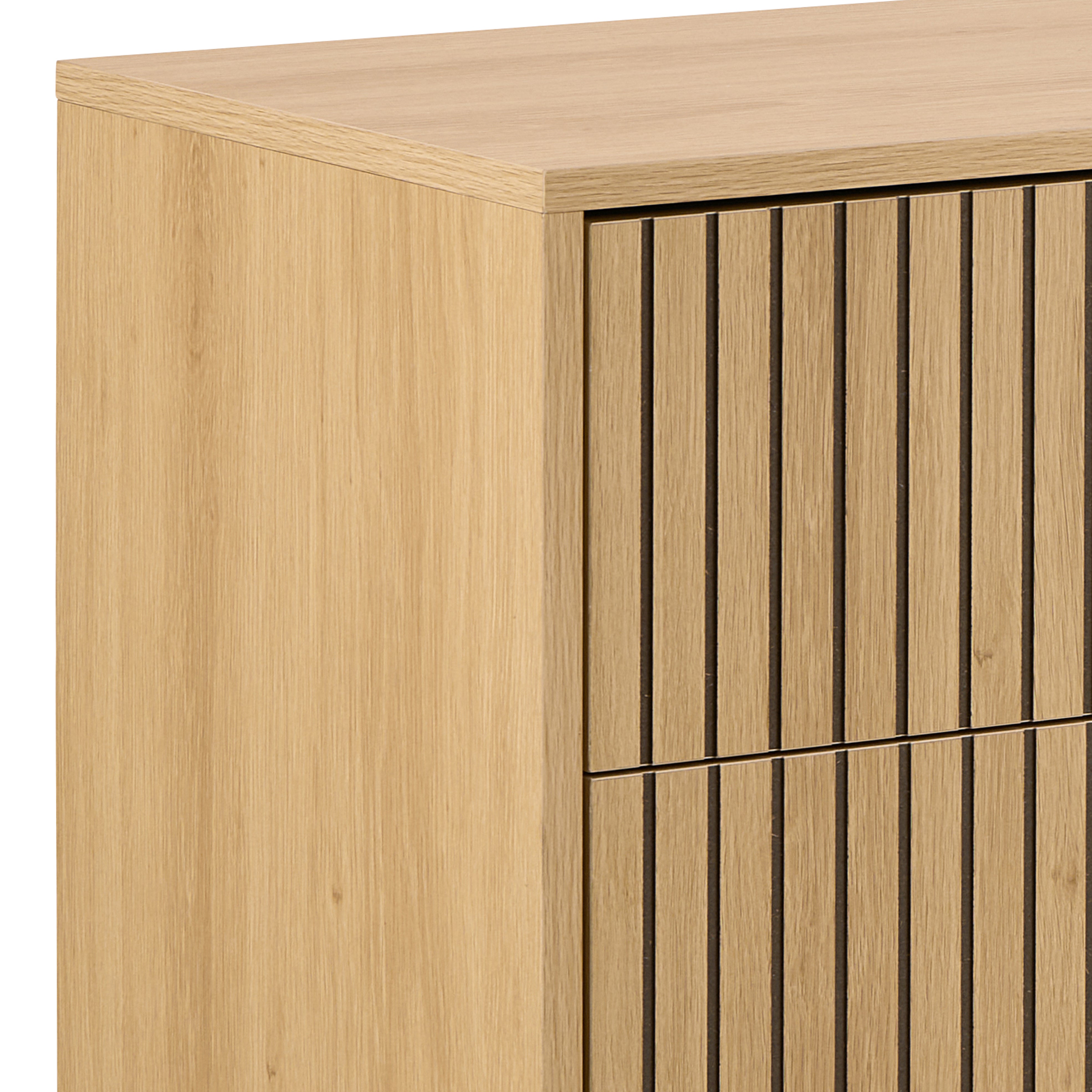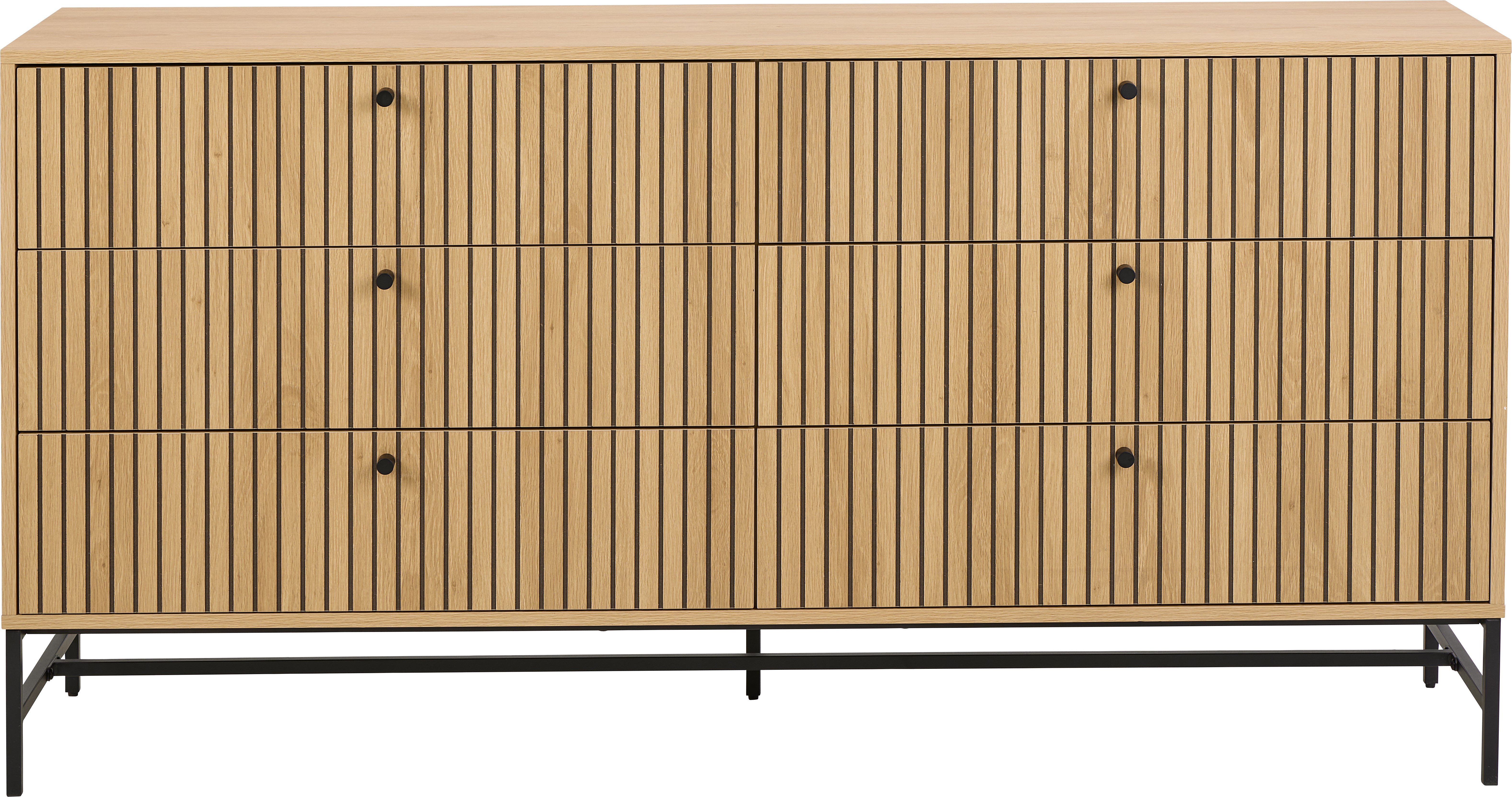 Dresser Albany is a stylish piece of furniture that combines modern design with functionality. Finishing in a shade of oak with a lamella front catches the eye, giving the interior elegance and sophistication. The contrast between the natural appearance of wood and black accents creates a harmonious composition, which perfectly fits in with both modern and classic arrangements.