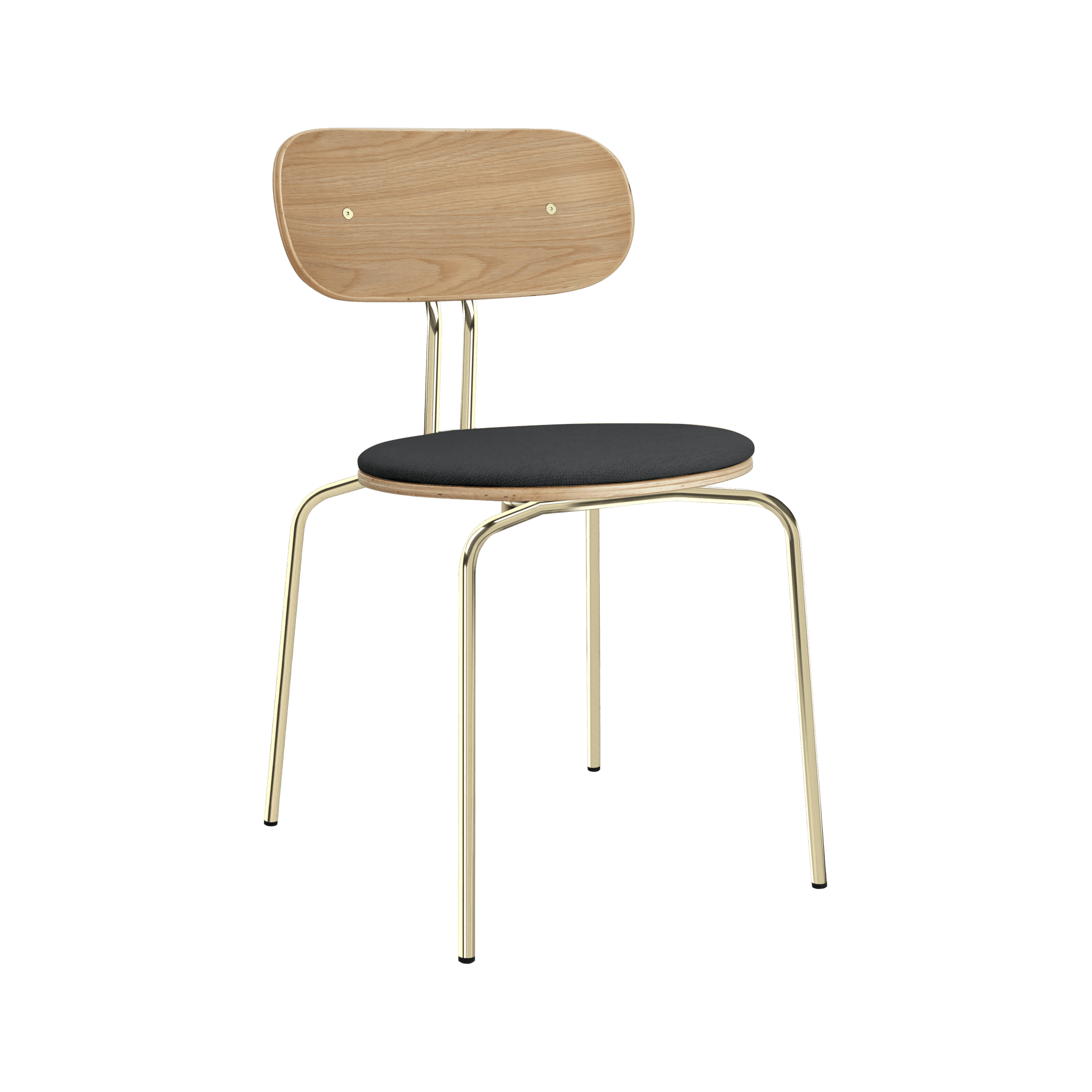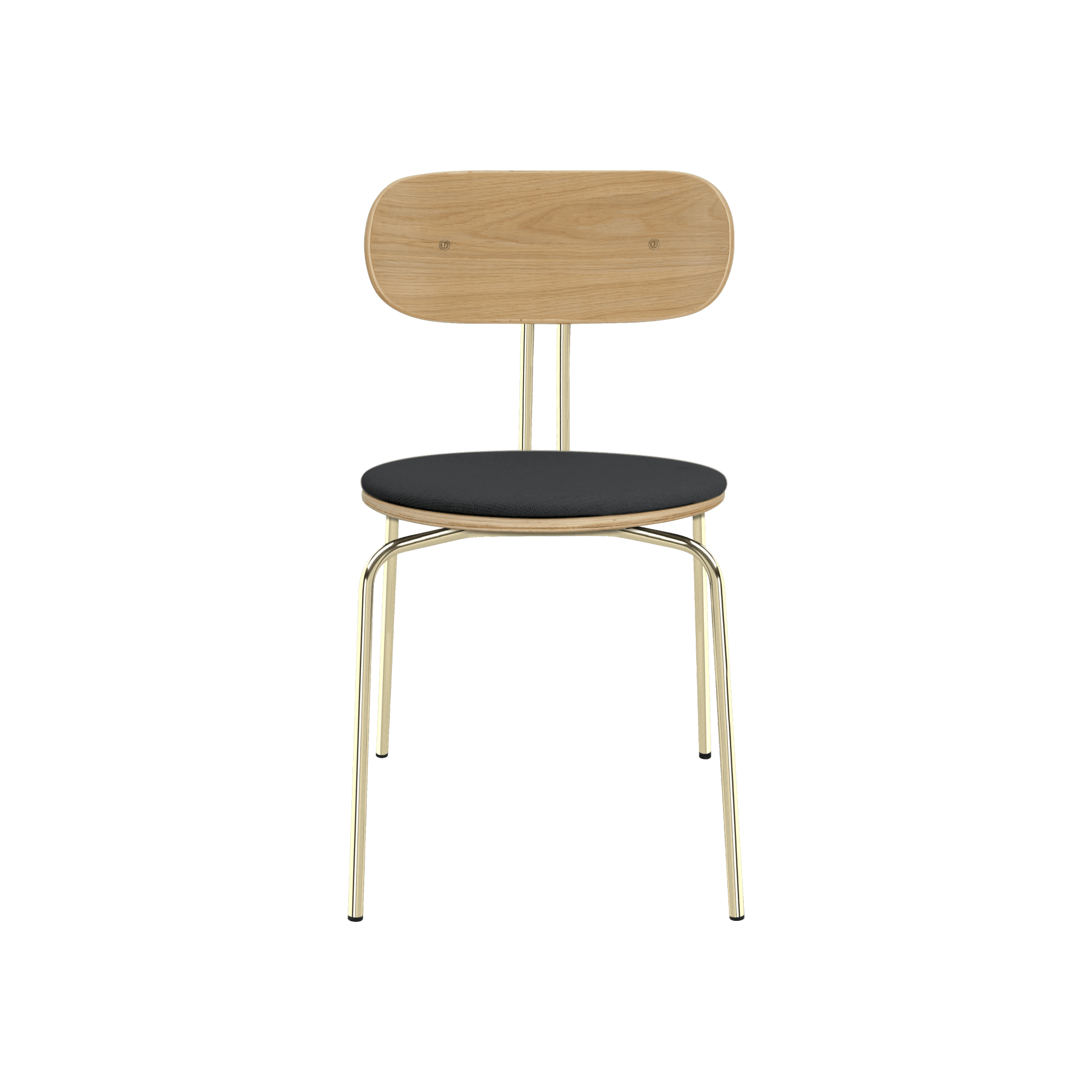 Chair Curious is elegant, light and minimalist furniture, made of oak veneer. It is available with brass or black legs, and the optional seat cushion provides additional comfort. You can choose a pillow from 17 colors of Horizons fabric, made 100% recycled, as well as in a brown or white shade of Teddy Bear fabric.