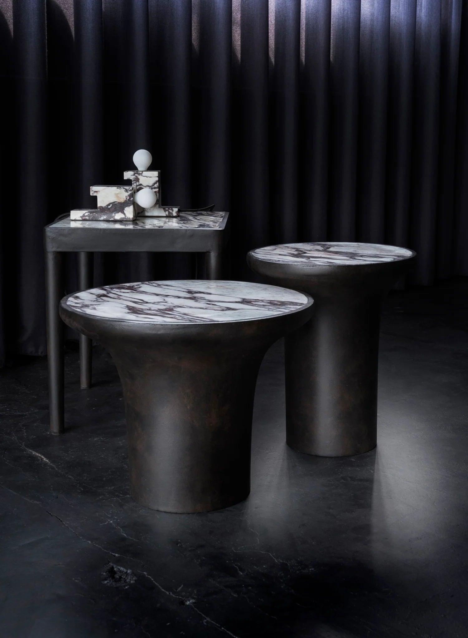 Tables They come in two versions, one with Calacatta tiles and the second version made of three types of exquisite marble, all tiles are mounted in the frame of the fibrous concrete table. Each table is unique due to the natural differences in the color and pattern of each marble.