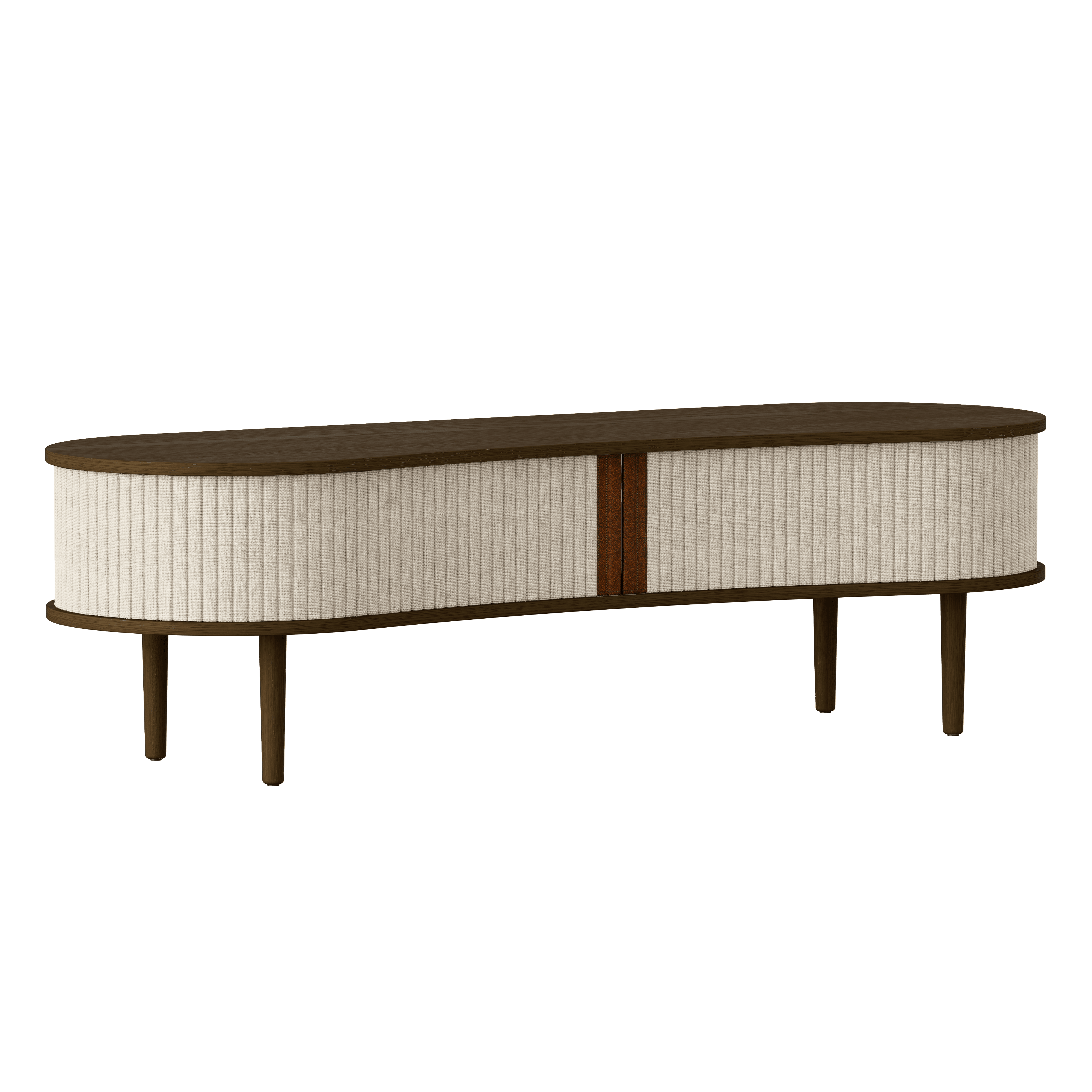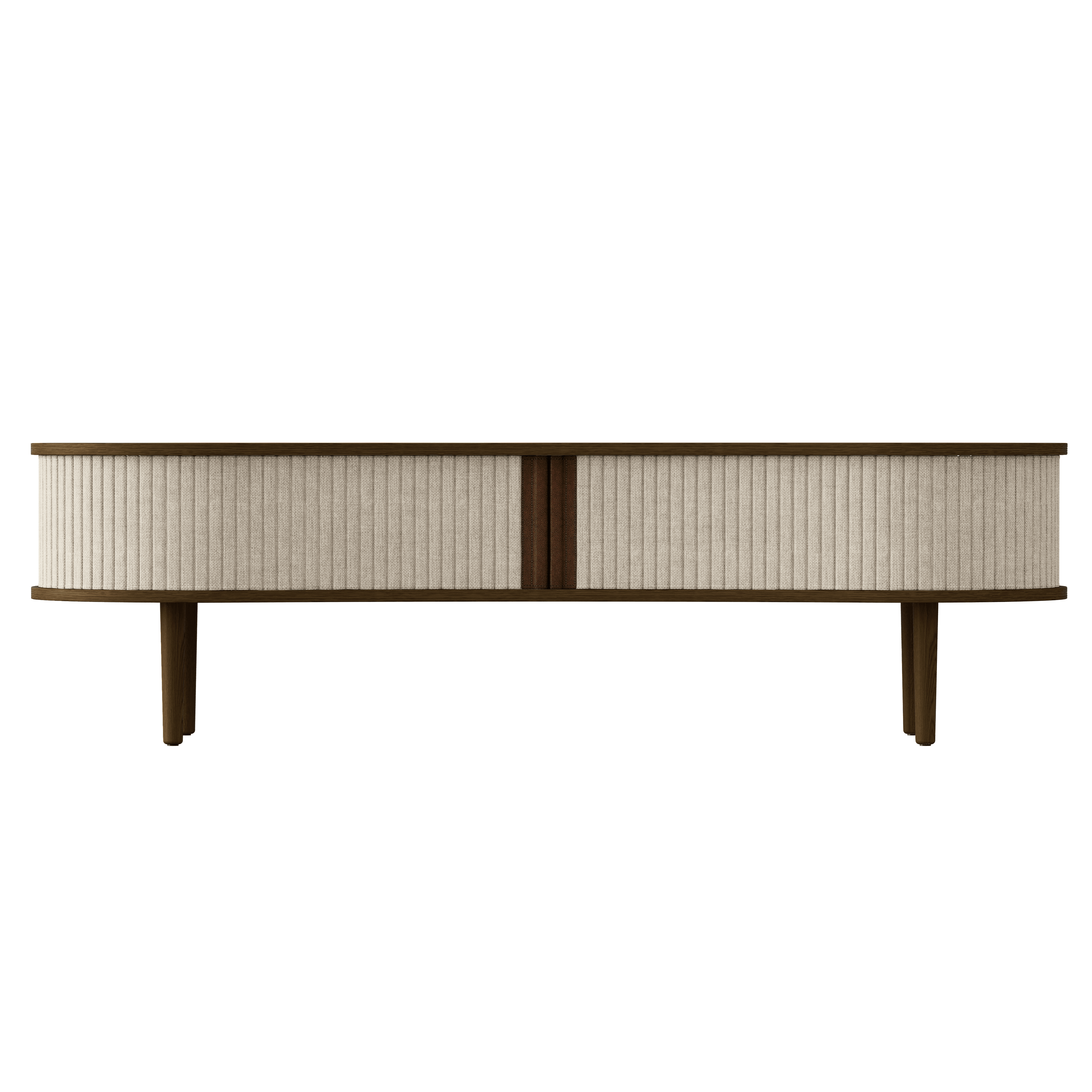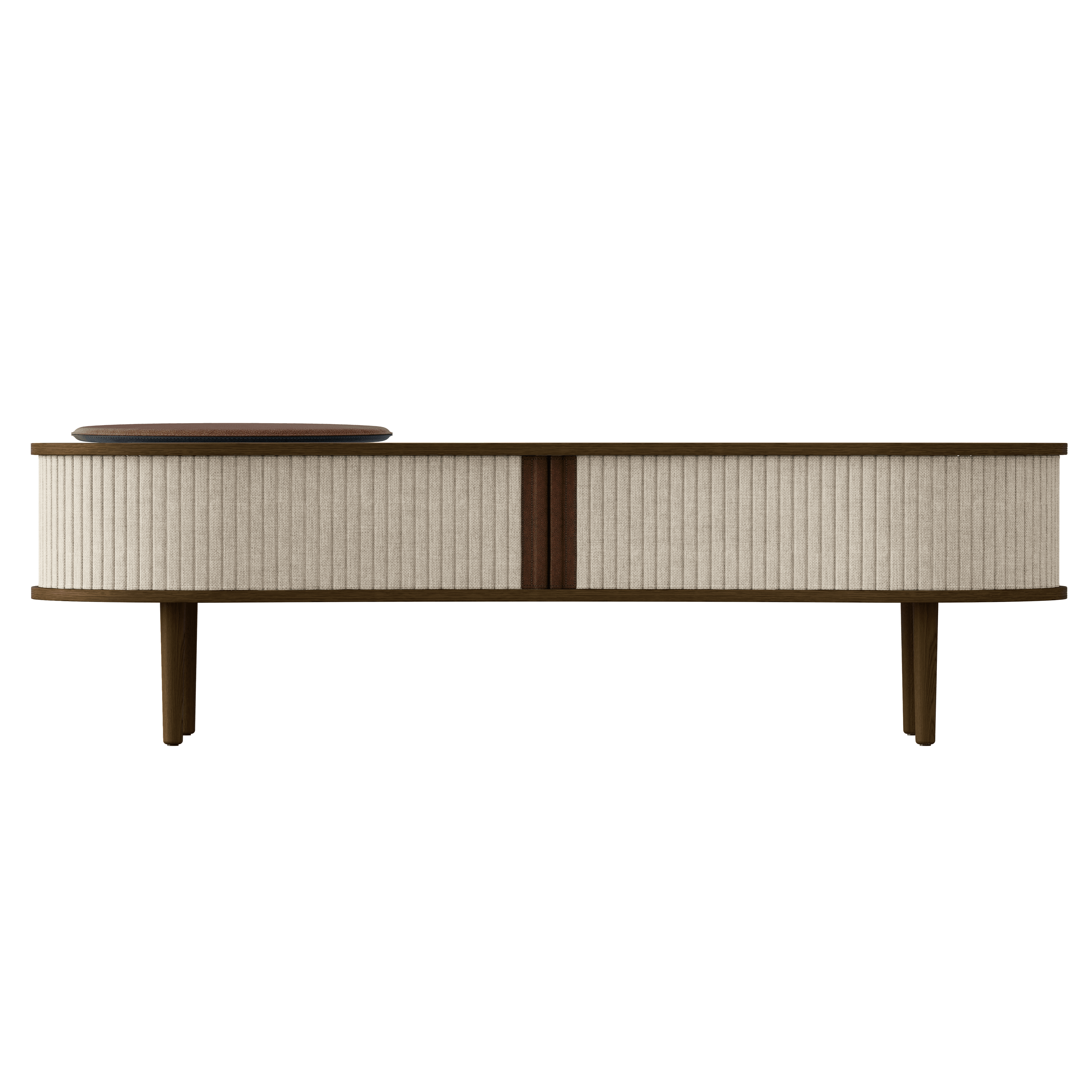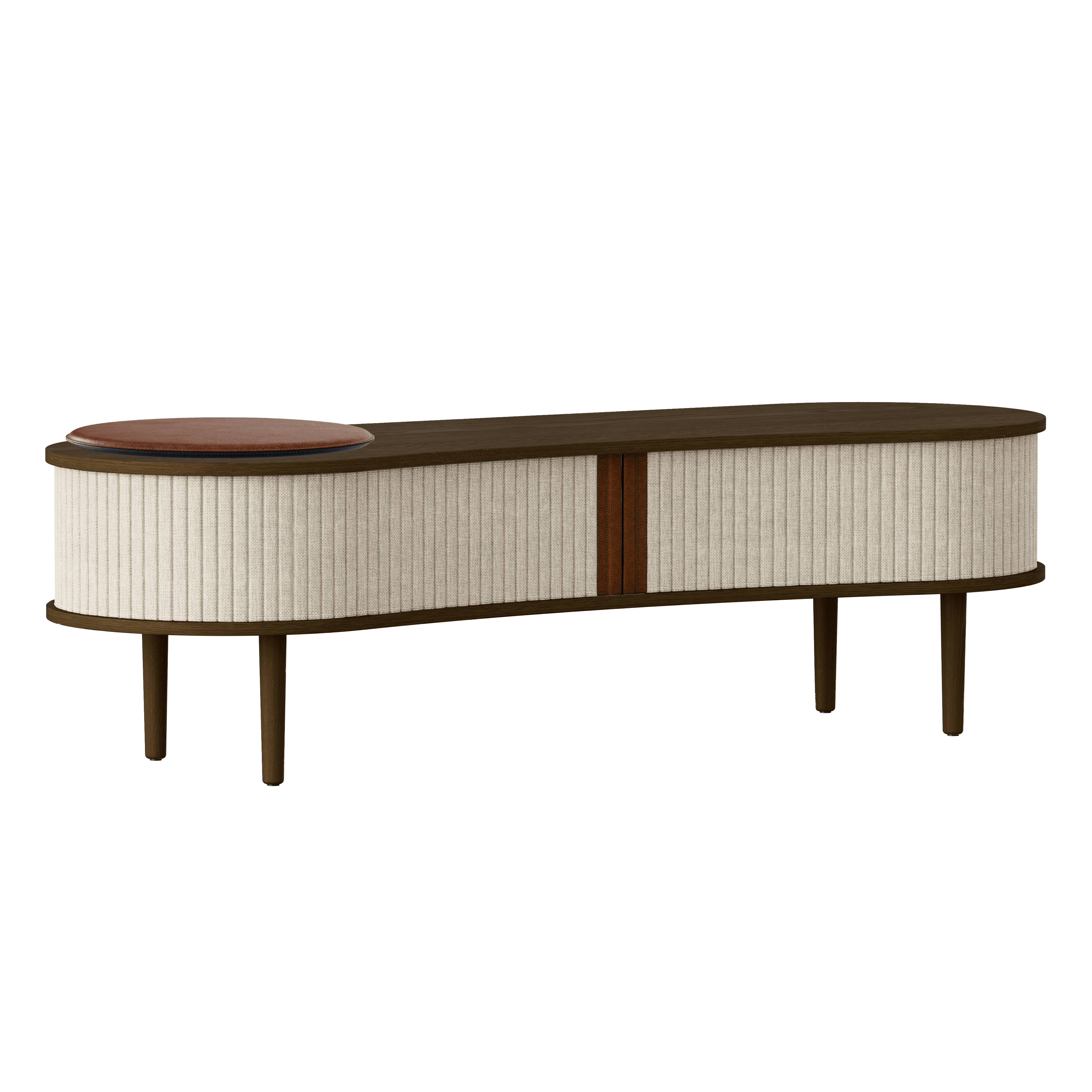 Available in three finishes - oak, dark oak and black oak - with blinds in four selected colors of Horizons fabric, 100% recycled. The blinds are replaceable, which allows you to easily refresh the appearance of the furniture without having to buy a new one, while saving natural resources. It is also possible to buy a seat cushion to increase comfort during use.